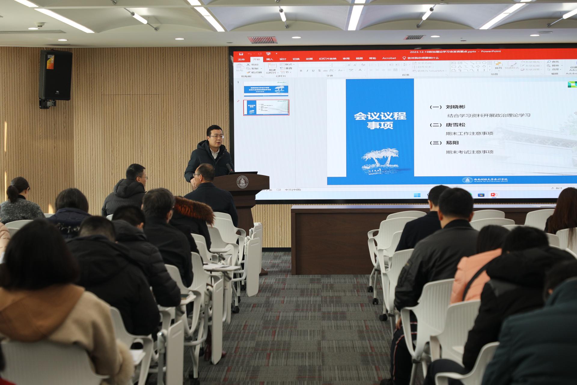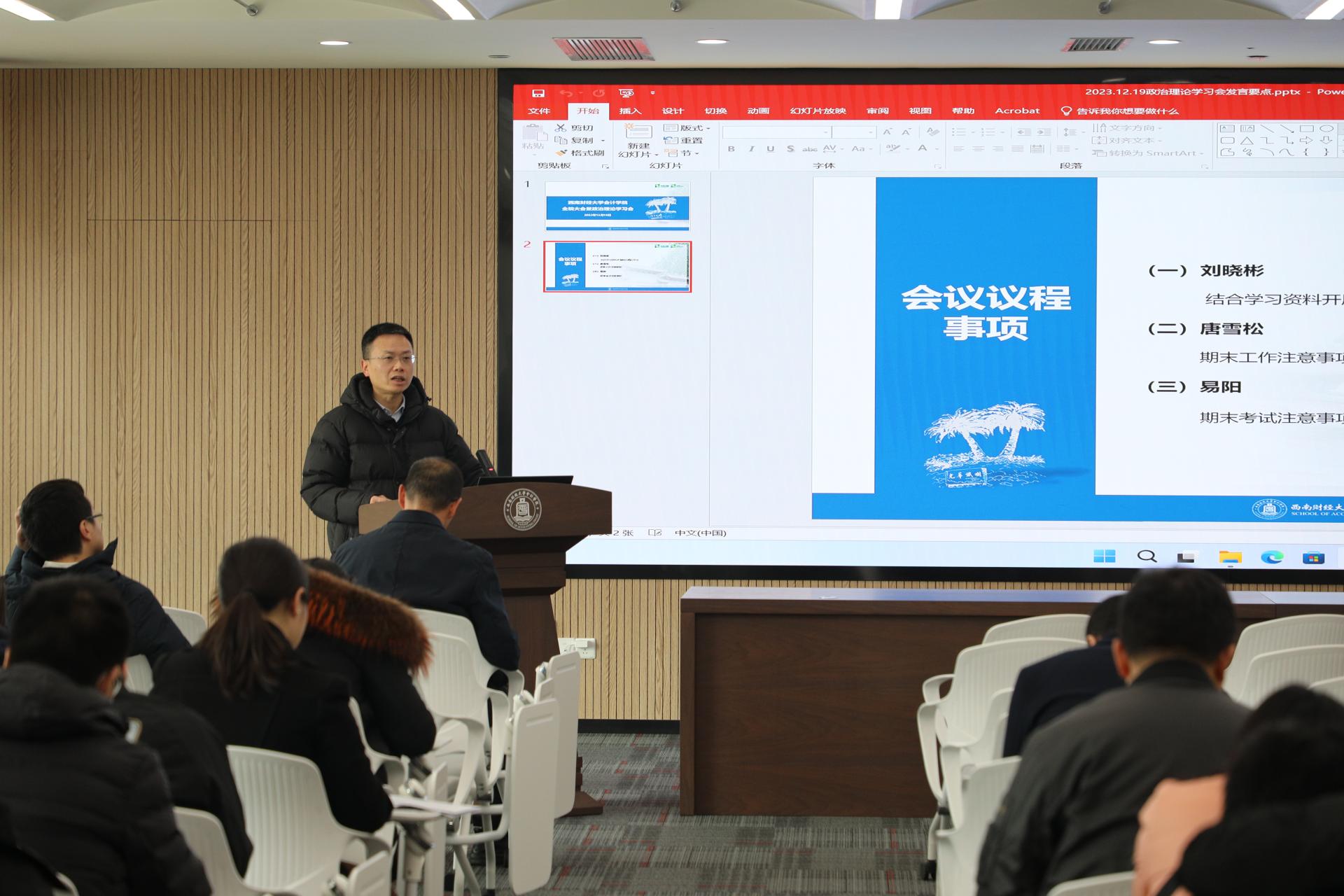 刘晓彬重点传达了中央经济工作会议精神,并从“五个必须”“12个字”的工作要求、九项重点任务、四个“抓落实”四方面展开领学。他强调,全院教师要进一步提高政治站位,准确认识和深刻把握习近平总书记重要讲话精神,深刻领会党中央对经济形势的科学判断,切实增强做好经济工作的责任感使命感。要始终保持奋发有为的精神状态,胸怀“国之大者”,立足本职岗位,主动担当作为,紧紧围绕高质量财会人才培养和老员工就业创业等重点工作,扎实推进公司事业高质量发展。