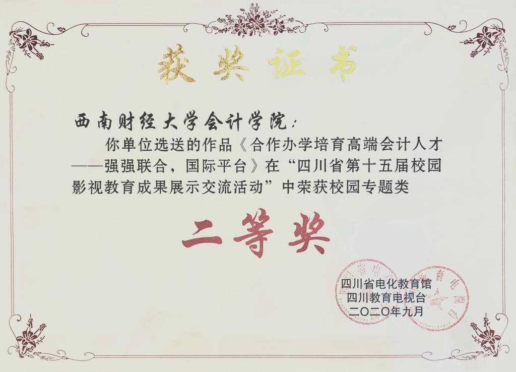 10月31日18:30,由四川省教育厅指导,四川省电化教育馆、四川教育电视台共同主办的四川省第十五届校园影视教育成果发布展示交流会暨颁奖典礼在南充高级中学临江校区举行,公司选送的作品《大数据与人工智能时代会计类专业的人才培养》《合作办学培育高端会计人才——强强联合,国际平台》获得校园专题类二等奖,《K1体育“战疫”故事汇》获得校园综合类三等奖。
