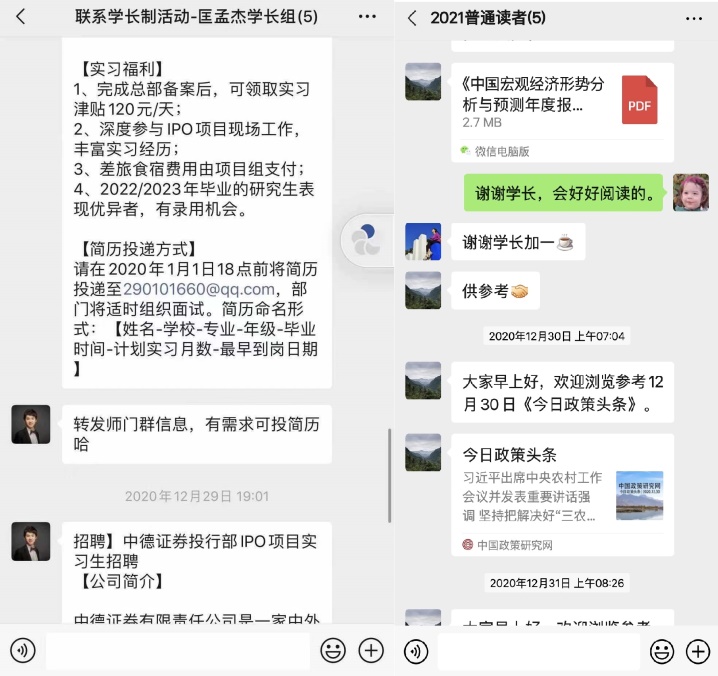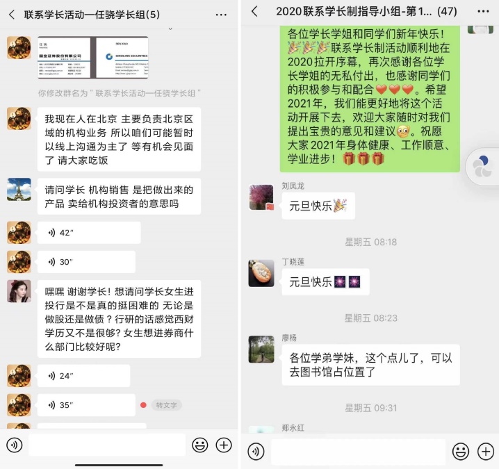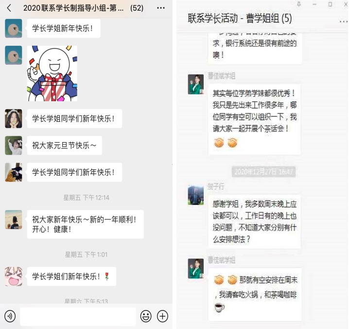 通过线上的方式,同学就职业发展、学术科研、人生规划等不同渴望得到前辈指导的方面向学长进行请教探讨,学长们热情回应同学们的问题并结合自身的经验与理解给出答复。学长和同学间的沟通交流并不只局限于微信平台,有学长和同学在2021新年伊始相约火锅,有学长诚挚邀请同学做客家中品茗闲话,各种途径都促进了学长同学间更有效的情感联系。