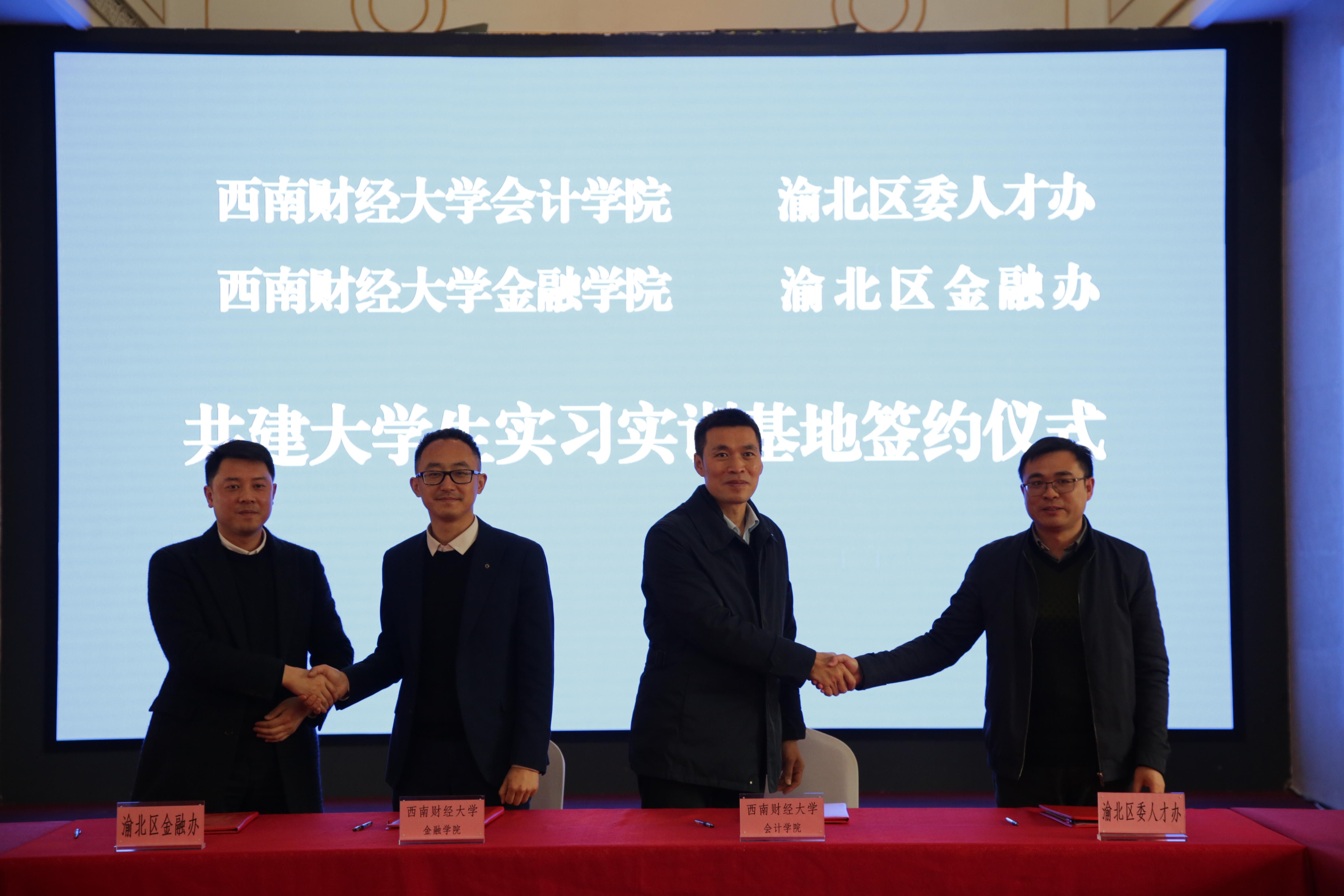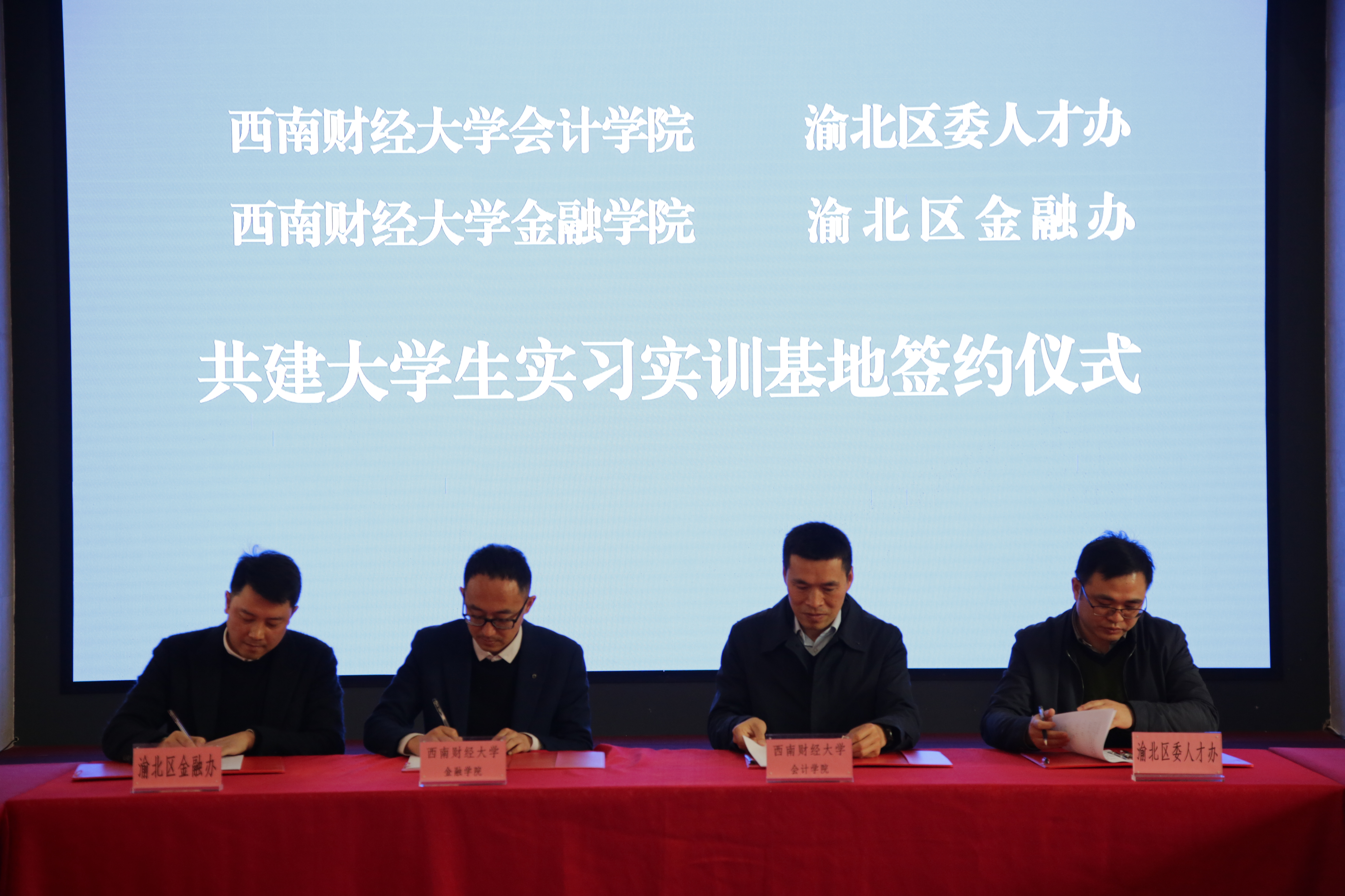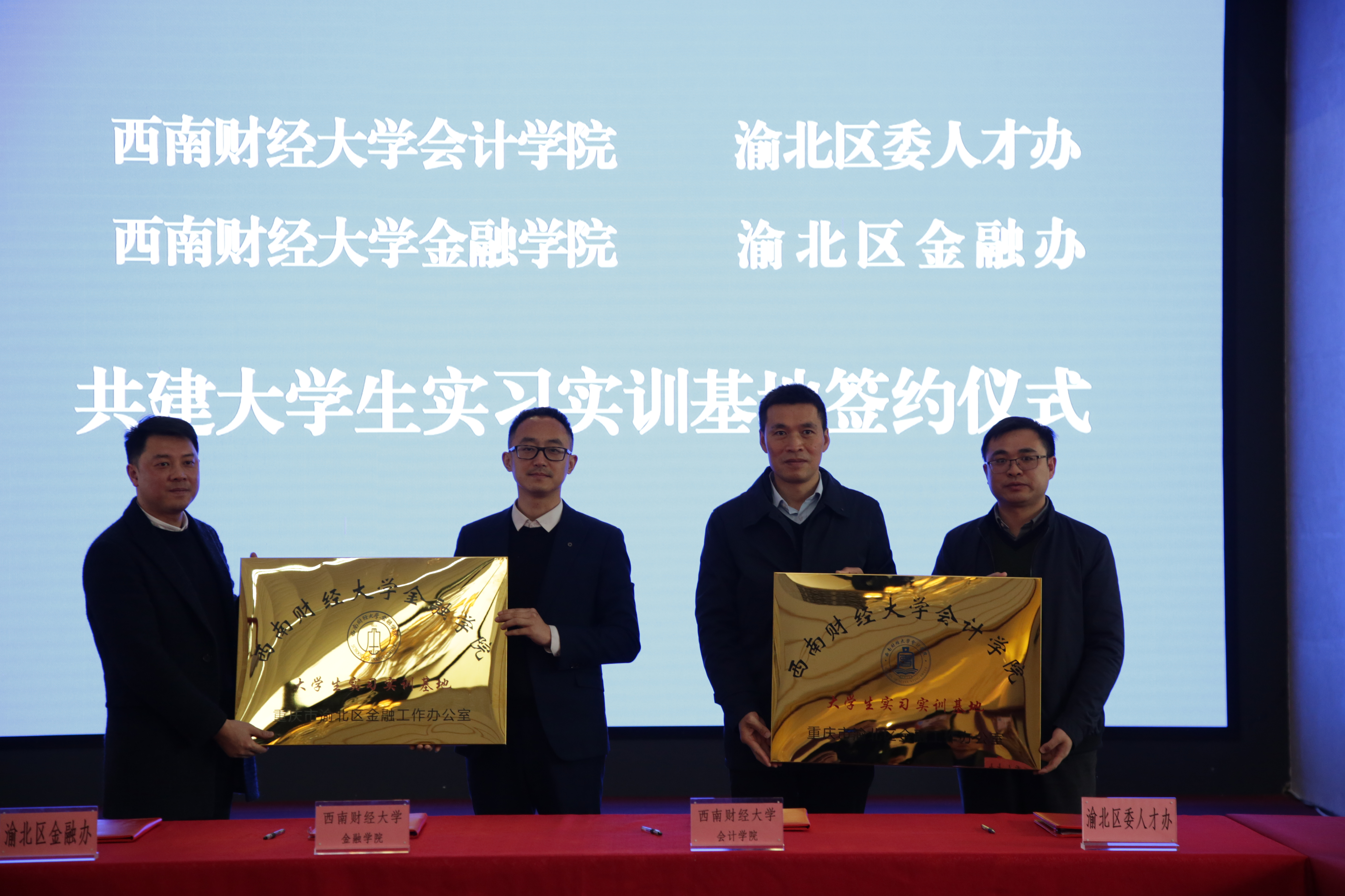 最后,在行业代表的见证下,谭洪涛副经理、黄文副书记与重庆市渝北区金融办、人才办代表签订合作协议,并为老员工实习实训基地授牌。