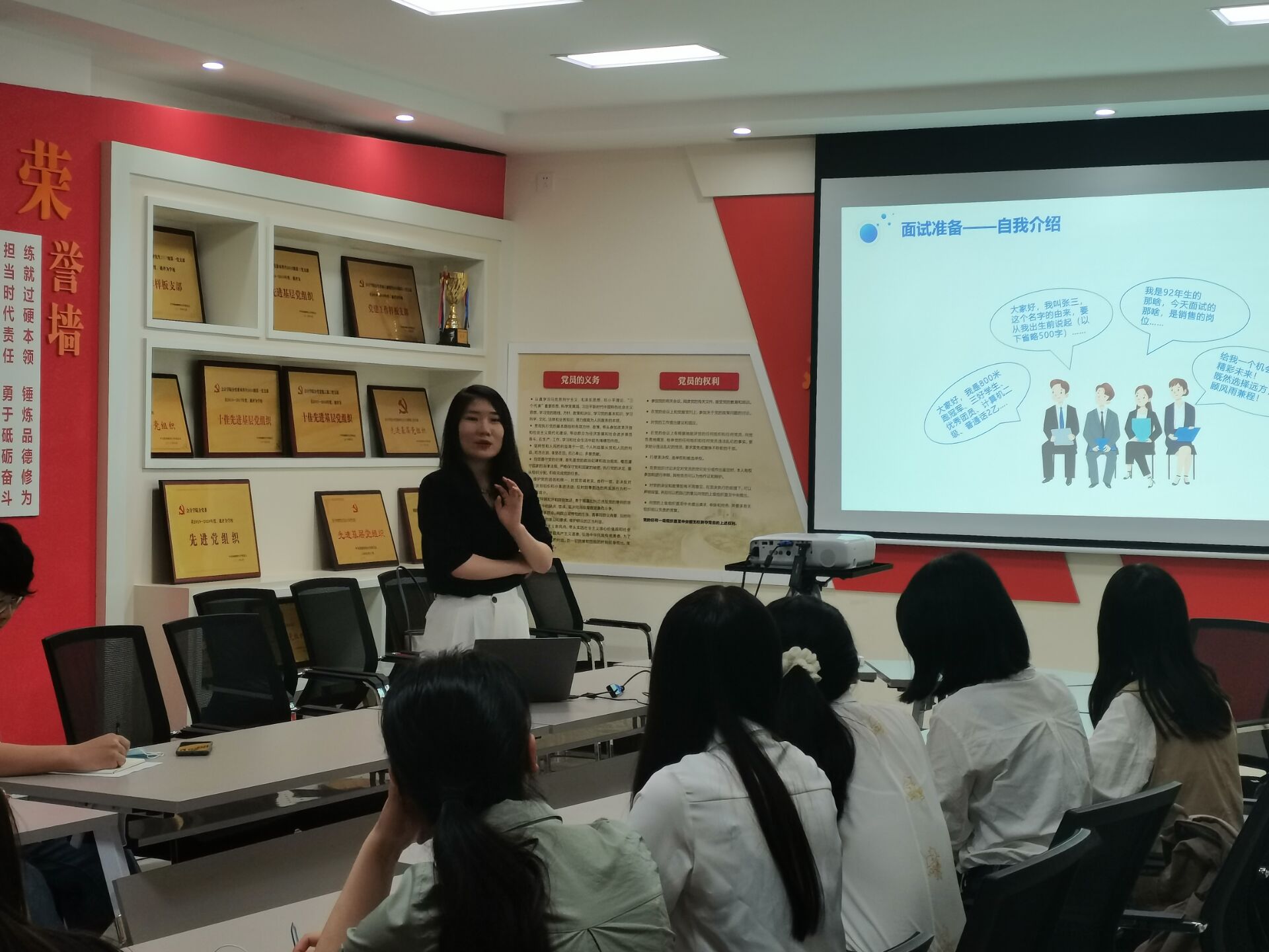 此次活动共分为模拟面试和简历一对一诊断两个部分。活动开始时,王荟女士给大家观看了一段蓝月亮公司的宣传片,短片介绍了蓝月亮公司的整体情况及员工感受。之后同学们在王荟女士的引导下进行模拟面试,在这场模拟面试中,同学们都发现了自己的不足。面试结束后,王荟女士给同学们介绍了一些面试中应该注意的问题,包括面试礼仪,面试题目类型及无领导面试的技巧。她提到,面试者在面试中要注意自己的仪态、学会倾听,以及无领导面试中要找准自己的角色与定位,通过自己的表现尽可能让面试官对自己有更深刻的印象。活动的最后一个环节是简历一对一诊断,在此环节中,同学们按顺序与两位老师交流沟通,获取简历修改建议。