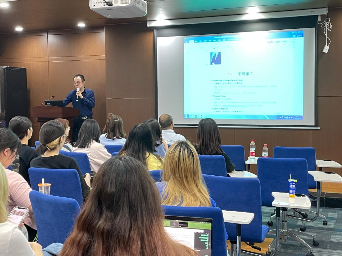 徐天然老师首先为同学们详细介绍了纽约城市大学巴鲁公司的相关信息,并就学习、疫苗、租房、安全、境外保险等事宜进行了讲解,提醒同学们做好巴鲁入学前的过渡。郝若欣老师为大家梳理了教材、实习报告等教务安排,同时也强调了毕业论文的时间线,督促同学们提前规划好大四的时间安排。董航老师简短介绍了交换生系统的操作步骤、项目专项奖学金的申请流程,并结合事例讲授了基本的邮件、面试礼仪规范。同时,项目老师补充推荐了重要的公众号平台,内容涉及平安留学、领事保护、机票动态等多方面信息。