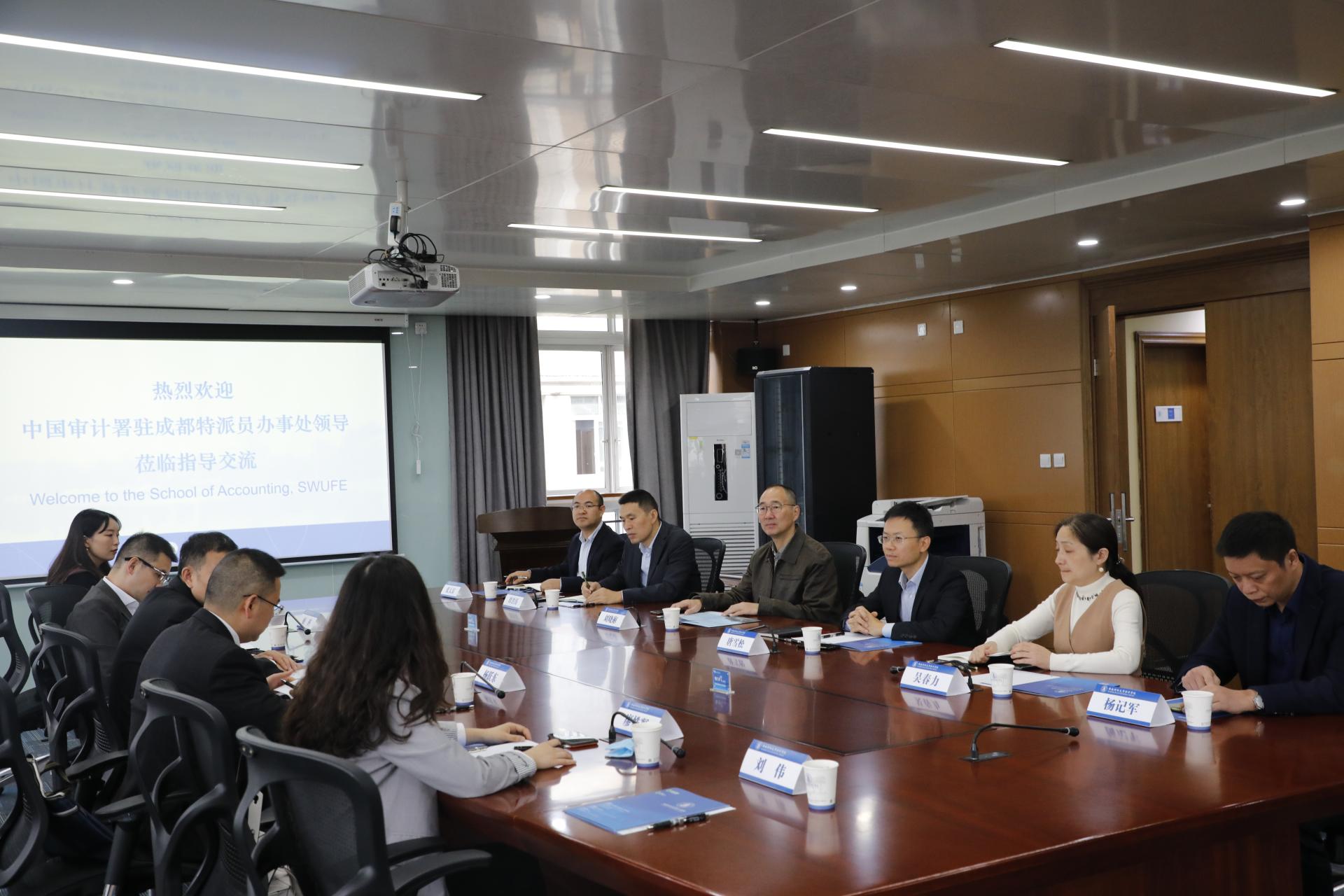 审计署成都特派办副特派员刘峰、人事教育处处长杨跃东、税收征管审计处副处长姬科及人事教育处副处长廖姝凝出席本次座谈会;K1体育领导和老师出席本次会议。
