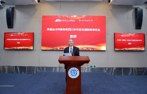 天健会计师事务所四川分所总经理阮响华先代表天健会计师事务所向获奖同学表示祝贺,并向参会同学老师们分享了当下会计行业的变化和趋势,面临的机遇和挑战。勉励同学们在校期间加强认知能力的提升,认知他人,认知自我,鼓励大家在加强专业知识的同时,多阅读人文科学经典,了解基本的经济学知识、主流的行为经济学观念,培养多元化的思维和宽广的胸怀。