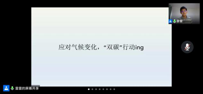 会议上,雷雷老师由气候变化引出话题,首先介绍了气候变化对环境、经济造成的影响,而后从“适应”和“减缓”这两个方面说明了应对气候变化的多项措施,并指出国际上各国需要共同行动,合作减排、坚持“共同但有区别的责任”原则。紧接着,雷雷老师向我们详细介绍了中国的减排目标——实现“碳达峰”与“碳中和”,同时也分别从企业、政府、投资者这三个群体的角度阐述了碳减排的具体行动和其中面临的风险和机遇,强调了三方相互影响、相互激励的密切关系。最后是学科相关的气候变化研究展望,雷雷老师从会计、金融、碳管理等学科的角度,分析了未来财经行业面临的挑战、职业发展的前景、和对新型人才的能力要求,让我们了解到在当今世界碳减排的背景下,我们作为财经院校的员工该具备哪些素质和能力为此贡献绵薄之力。