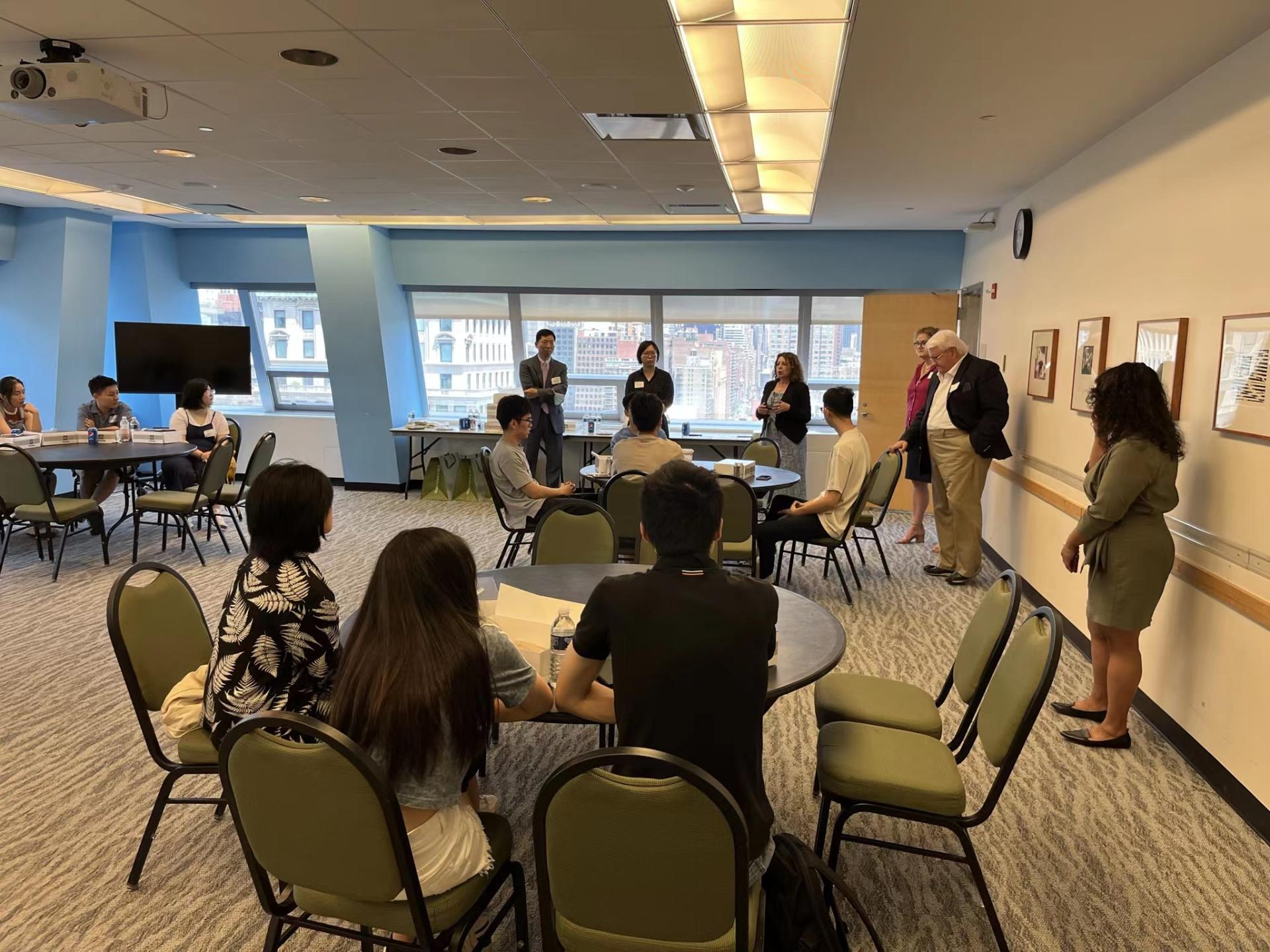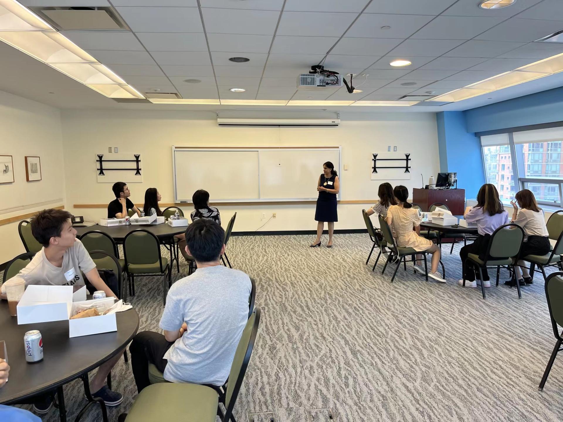 在午餐会交流期间,教授及老师们从学习、课余活动、实习等方面与同学们展开了深入交流。首先,Lee Myungsoo教授针对同学们关于如何快速适应语言环境的问题进行了解答。他向同学们讲述了自己过去在美国的求学经历,鼓励大家积极与授课教授互动交流,在课堂上大胆提问,增进与身边来自不同国家的同学的沟通,快速提升英文实力,形成英语逻辑思维能力,培养自身国际化视野,充分感受东西方文化的融合与碰撞。随后,巴鲁公司国际员工服务中心的Elpidia Delgado老师对于同学们在后疫情时代的大背景下选择留学的勇气与决心表示肯定。谈到如何支配学习之外的课余时间时,她表示,同学们应当抓住机遇,在忙碌的课业之余,可以去博物馆感受艺术之美,充分沉浸于纽约多元与包容的文化氛围,丰富课余生活的同时提升自我综合素质。接着,她介绍了巴鲁克公司丰富多元的社团设置,引导同学们根据自己的兴趣爱好,积极参与社团活动,培养自己多方面的能力及创造力,同时每周至少两次的社团活动也有助于大家与志同道合的社团其他成员增进友谊,提高人际交往能力。针对同学们关心的在美实习的话题,商公司国际项目专员颜榕老师向大家介绍了北美职场文化,并建议同学们利用公司毗邻华尔街、曼哈顿中城的优越地理位置,合理发掘公司宝贵的员工资源,踊跃参与公司定期举办的实习交流分享会,可以和其他求职的同学交流各自的求职面试实况及工作心得,交换各自手中的资源实现互利,学会展现自己的专业技能与综合能力,以便大家未来更有效地应对日益激烈的竞争。