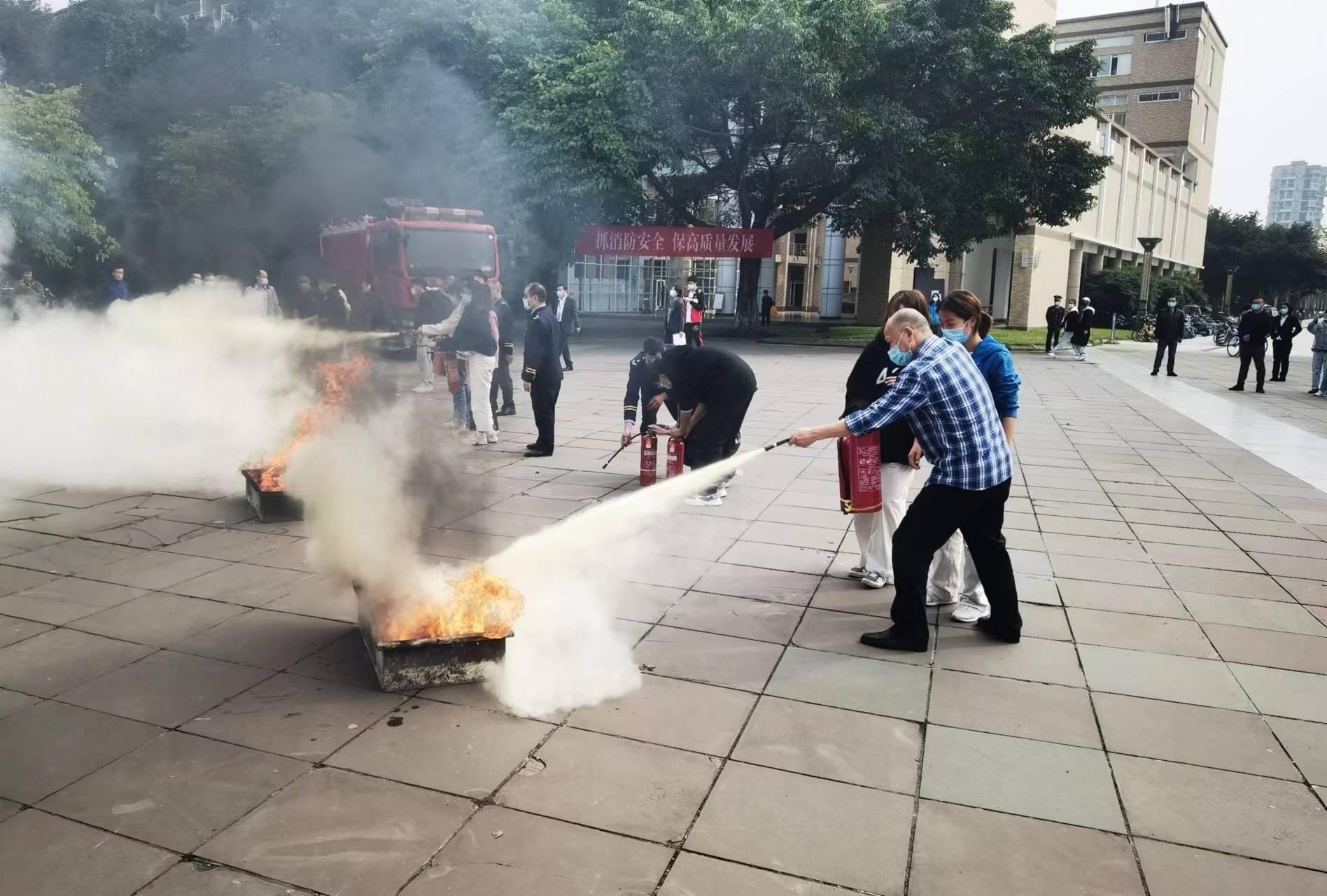 在消防演练环节,邹涛老师的有序安排下,同学们冒着浓烟有序撤离到楼下安全地带,完成了疏散撤离任务。在灭火演练环节,宋晋老师与代表同学参与现场灭火演练,用干粉灭火器扑灭大火,掌握基本灭火技能,成功将演练火焰扑灭。