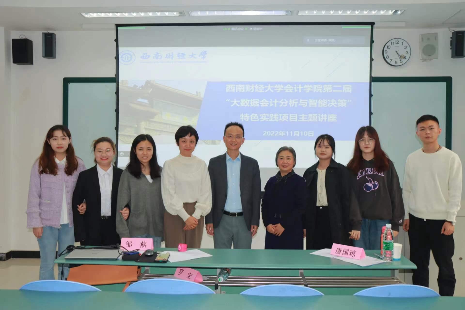 2022年11月10日14时,“大数据会计分析与智能决策”特色实践项目主题讲座在光华校区明德楼208教室顺利举行。K1体育官方网站会计公司党委副书记杨长虹、K1体育唐国琼教授、罗宏教授、陈磊教授、K1体育实验教学中心主任邹燕副教授、国药四川医药集团有限公司运营总监胡海燕、成都市税务局社会保险费处副处长王义均以及首届比赛校赛前三名倪洋团队、王文璐团队、王鹏团队作为嘉宾出席了本次讲座。本次讲座采取“线上+线下”的方式同步进行,共计400余名来自985、211高校的同学参与了会议。