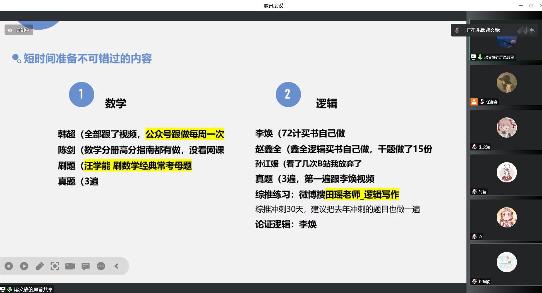 朱奕潇同学的分享主要从择校、时间规划、学习建议和其他建议等方面展开,其中,她从时间规划的角度,详细介绍了各科的复习顺序和学习方法;任育欣同学以自身的考研经历为切入点,重点分享了他在院校选择、避免踩坑和初试复习等方面的经验;梁文静同学首先分享了她在考研、保研、选调和就业之间的纠结与选择,随后介绍了如何短时间准备初试,最后围绕复试不同的方面,详细分享了她的面试经验。