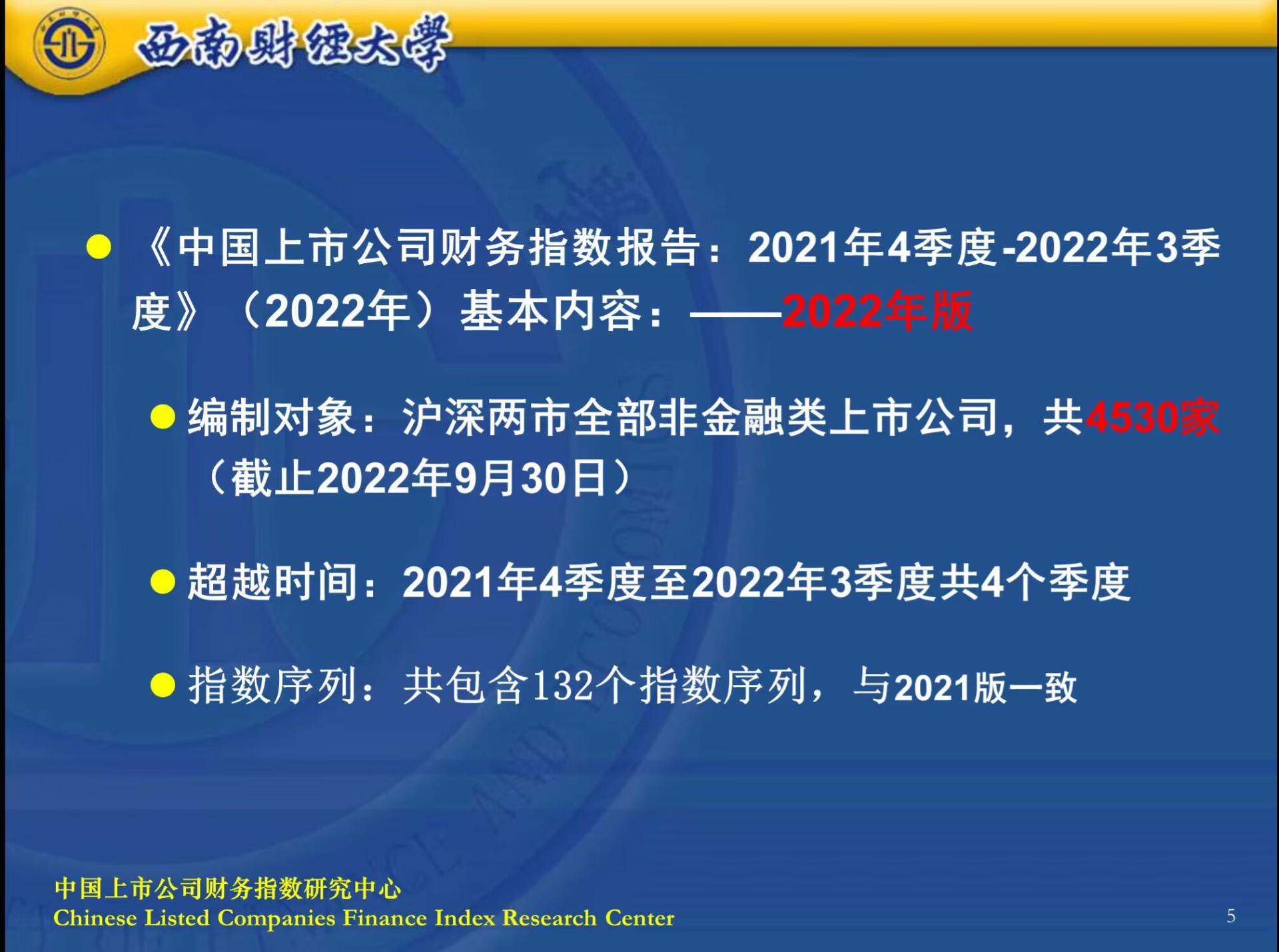 此次发布的财务指数报告,编制了跨越2021年第4季度到2022年第3季度之间共4个季度,包括偿债能力指数、营运能力指数、盈利能力指数、现金流量能力指数、成长能力指数和一个反映上市公司综合财务能力运行变化的综合财务指数在内共6大类指数类型,以及包括1个综合指数与分市场指数、分地区指数、分企业性质、分行业指数共4大类分类指数,共编制132个指数序列。