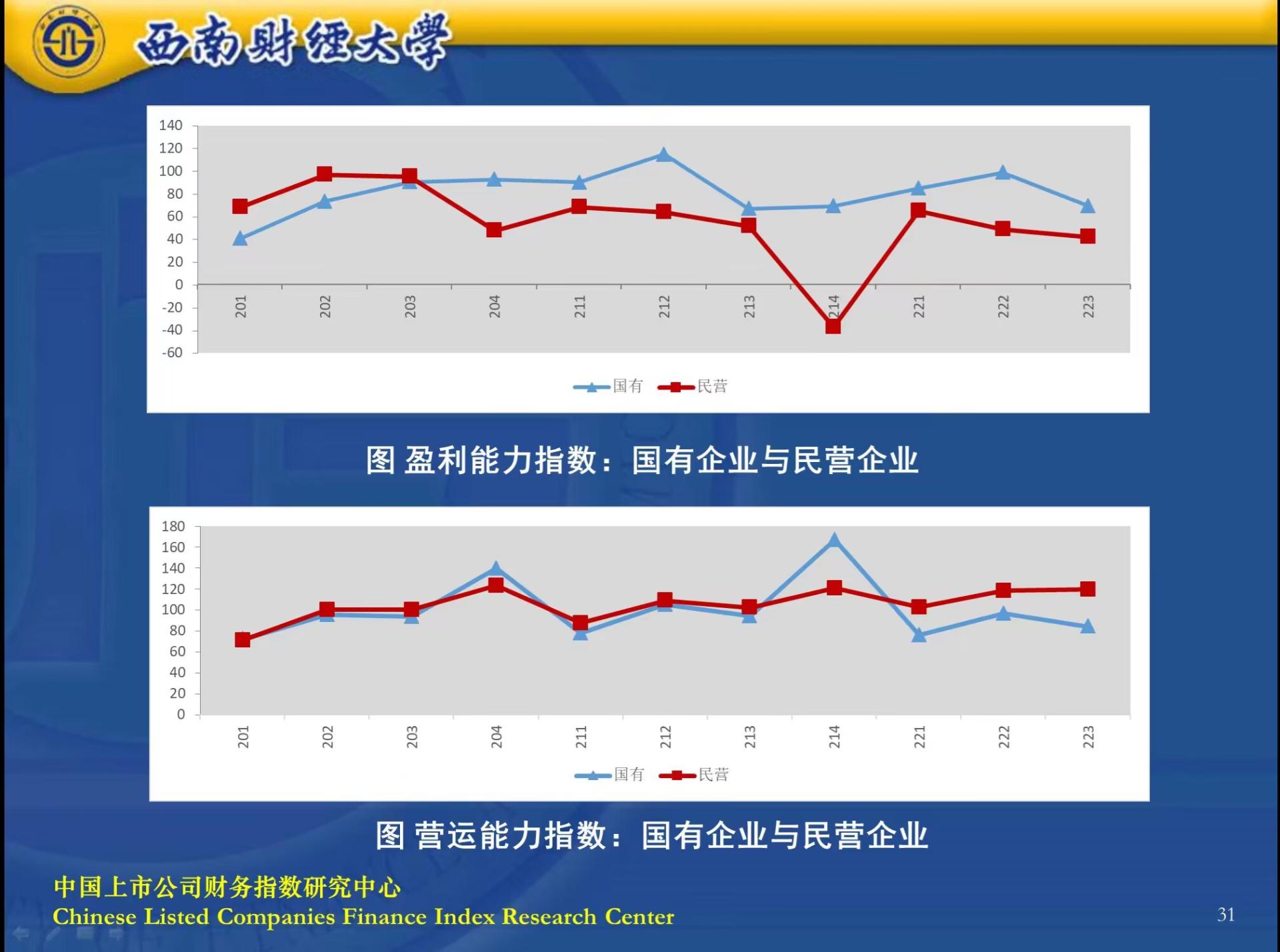 报告显示,2022年度上市公司盈利能力、成长能力指数无显著增长、偿债能力指数呈一定下滑趋势,表明2022年上市整体发展受到一定限制。中小板在总体财务能力指数、现金流量能力指数上表现最佳;创业板在盈利能力指数、偿债能力指数上表现显著弱于主板、中小板,尤其是偿债能力表现出显著的“债务规模效应”,即公司规模越大,公司偿债能力越强。总体财务能力指数、现金流量能力指数、营运指数、成长能力指数表现上,民营上市公司均优于国有上市公司;在偿债能力指数上和盈利能力指数表现上,国有上市公司优于民营上市公司;除营运指数,其余指数国有企业波动幅度均小于民营企业。