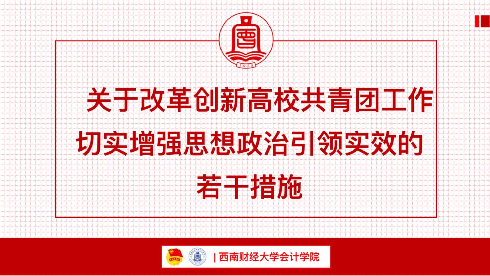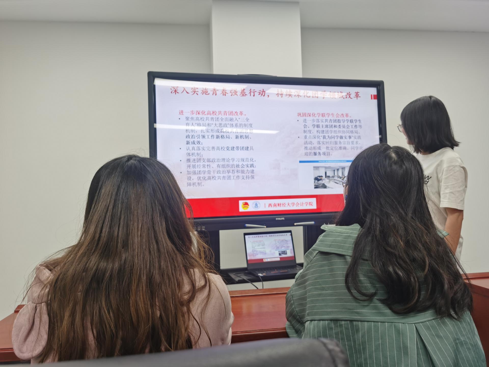 团委书记王慧领学《关于改革创新高校共青团工作切实增强思想政治引领实效的若干措施》、《共青团指导员工联合会工作的若干规定》、《2023年四川公司共青团工作要点》以及《共青团K1体育官方网站委员会2023年工作要点》等系列文件。她指出,公司共青团要始终围绕中心、服务大局,引领公司各级团学组织和团学骨干紧跟公司推进“双一流”建设,紧扣新财经主题,要在“大思政”和“三全育人”的大格局中切实担负起团组织的政治责任和职责使命,发挥好政治功能,做到“党有号召,团有行动”,落实共青团工作要点,扎实形成公司共青团思想政治引领工作新格局、新机制、新成效。