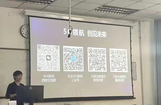 张晓颖详细介绍了中兴通讯的发展历程和中兴财经在中兴通讯发展中所起到的关键作用,并解读了中兴财经的立体化航系列人才发展体系。最后,张晓颖表达了中兴财经渴望人才,珍视人才,希望同学们可以加入中兴财经,感受5G时代下的创新浪潮,一起为中国科技建设努力奋斗!