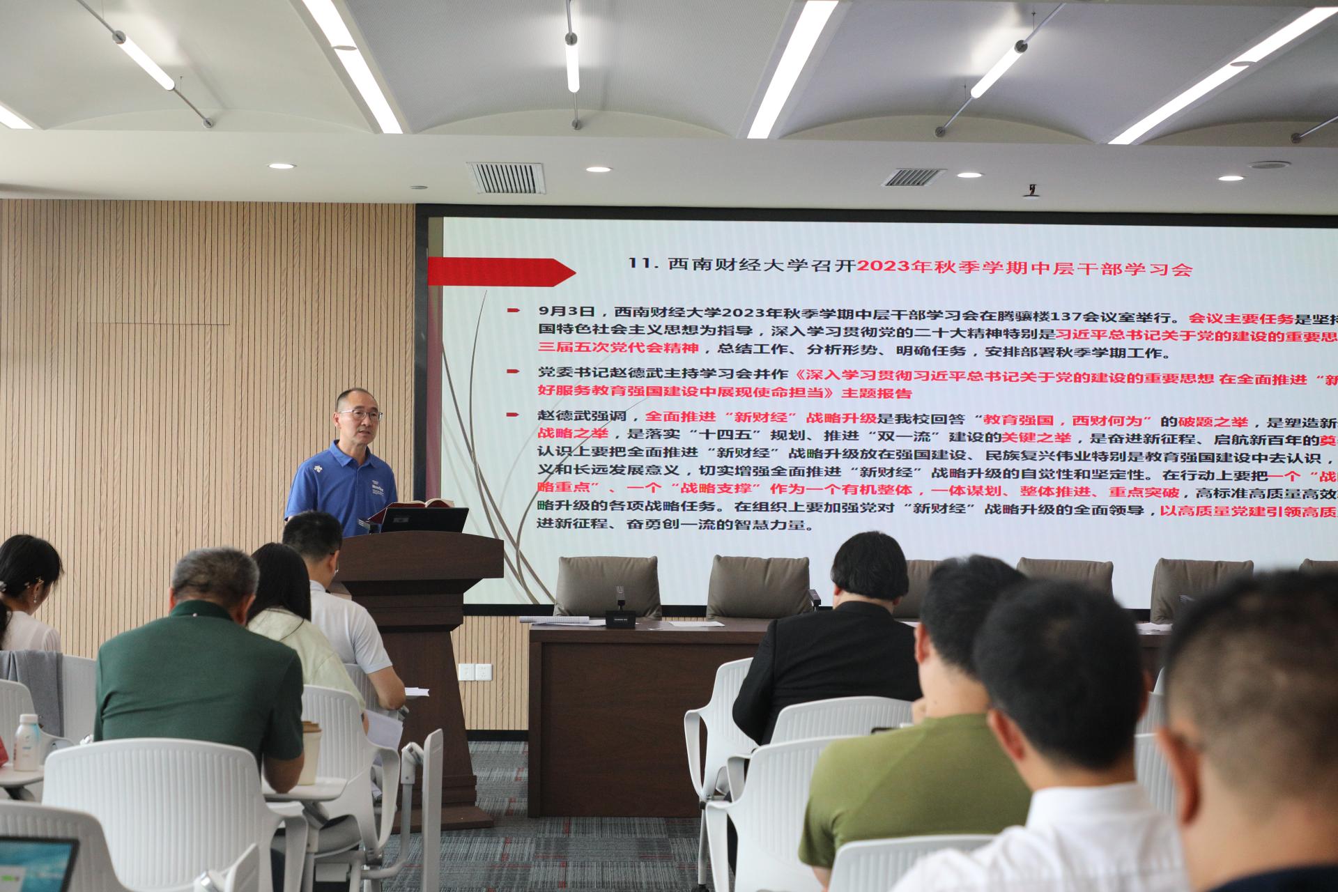 会上,刘晓彬导学了习近平总书记教师节重要指示精神及教育部党组传达学习习近平总书记教师节重要指示精神的会议精神,习近平总书记在四川考察、主持召开新时代推动东北全面振兴座谈会时的重要指示精神,指出公司教师要深刻理解习近平总书记重要指示精神,弘扬教育家精神,为强国建设民族复兴伟业作出新的更大贡献。通报了公司学习贯彻习近平新时代中国特色社会主义思想主题教育总结会议精神和公司党委主题教育专题民主生活会情况。学习传达了全省教育系统防灾减灾和安全生产工作电视电话会议及公司安全稳定专题工作会精神,强调“安全重于泰山,稳定压倒一切”,进一步加压、明责,以务实的精神、细致的举措加强落实责任到落实到每个岗位每位工作人员。重点学习了公司召开2023年秋季学期中层干部学习会会议精神,从认识、行动、组织层面深入理解全面推进“新财经”战略升级中的重要问题,秋季学期要立足“四个背景”,围绕一个“中心任务”“三条主线”,高标准、高质量、高效率推进党的建设提质增效、深化员工管理改革服务、创新团队建设体制机制、推进专业布局优化调整、深化人才人事制度改革、教师职业发展规划、百年校庆筹备等公司各项主要任务在公司落地落实。