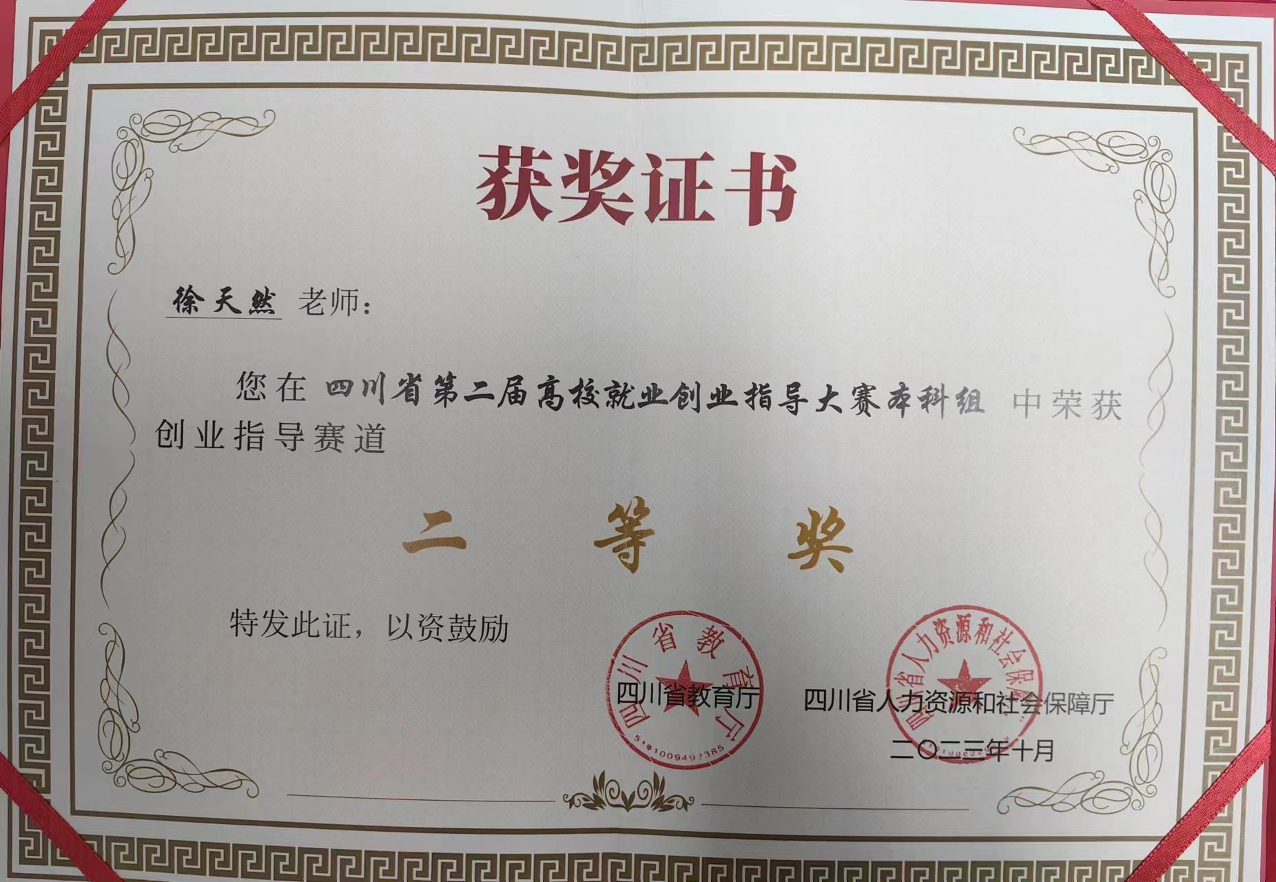 近日,公司辅导员王慧老师、徐天然老师分别荣获四川省第二届高校就业创业指导大赛特等奖与二等奖。