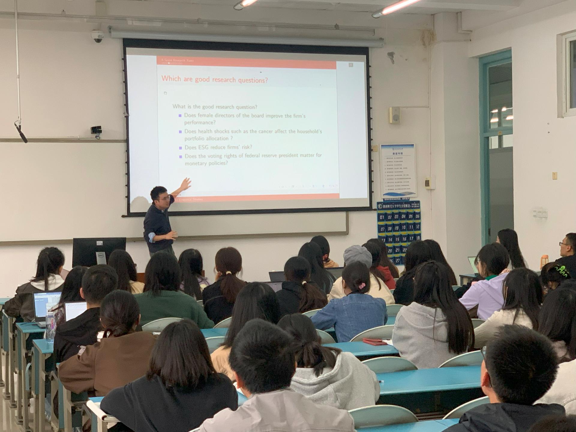 讲座伊始,笪老师以自己的经验为例提出实证研究一般分为三个阶段:确定研究选题、提出问题、培养研究技能。笪亨果老师通过提问的方式了解同学们对选题的认识,这种互动与实例分析相结合的方式使同学们更能体会选题的重要性。笪亨果老师提出,研究选题应关注其重要性,具体表现在是否产生了新知识或为旧知识提供了新视角。其次,笪亨果老师以自己员工研究的蚂蚁金服上市退市案例进行举例,强调研究问题的提出主要基于两点,即阅读文献与关注现实事件,推荐同学们订阅相关财经新闻以增强对现实事件的了解。笪亨果老师向同学们分享了实证研究的相关技能,提出数据分析能力将决定实证研究的下限,鼓励同学们多多培养研究技能,将自身投入到研究中去,从而实现终身研究。笪亨果老师还针对同学们的疑惑进行了具体的解答。