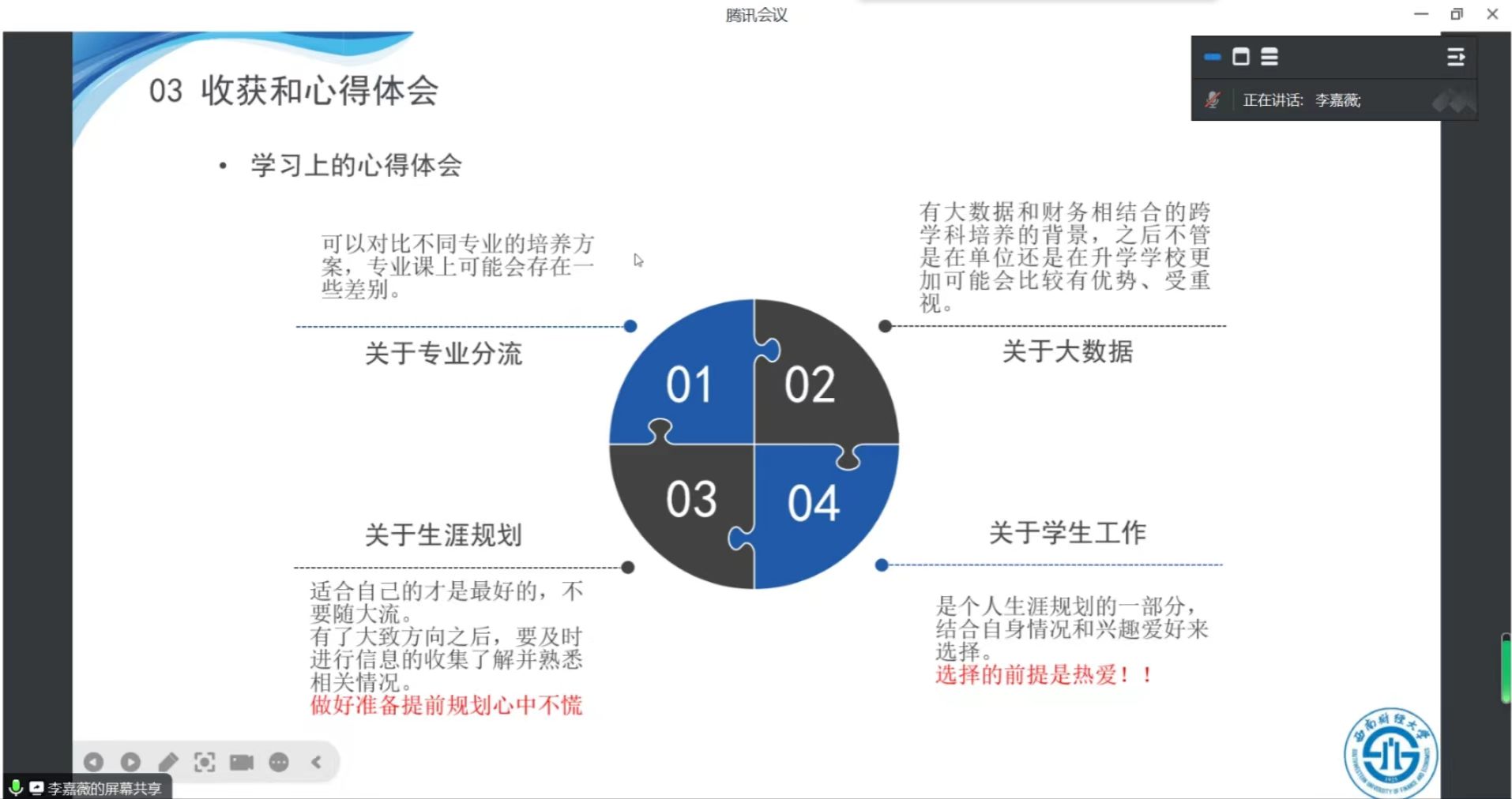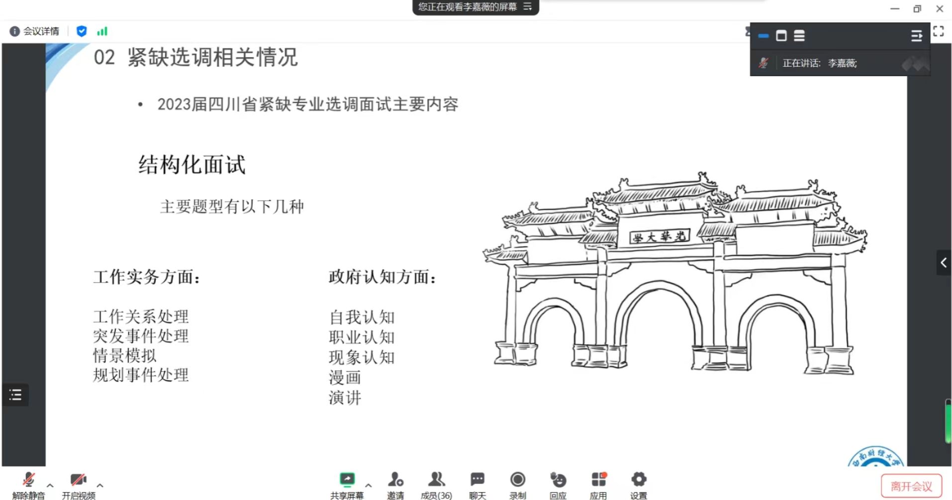 分享会中,李嘉薇就个人背景和紧缺选调相关情况进行了简要介绍,结合个人经历为大家提供了备考、生活等方面的建议。李嘉薇从选调范围、资格条件、招录流程、笔面试相关内容四方面介绍了紧缺选调的相关情况。她认为同学们需要及时关注选调公告中的变化,并对照自身情况,明确未来努力方向。在笔试准备方面,李嘉薇为大家介绍了笔试的具体范围,分析了不同内容的侧重点,提醒大家要注重日常积累,有的放矢,多看多练。在面试方面,李嘉薇主要介绍了结构化面试的主要题型和注意事项,分别对工作实务类和政府认知类的题型进行了举例说明,并鼓励同学们多多锻炼自己的语言表达能力。在收获与心得体会方面,李嘉薇建议同学们提前做好生涯规划,及时进行信息的收集并熟悉相关情况,而非跟随大流;在学习生活中也要学会劳逸结合,积极对外寻求老师和同学的帮助。在提问答疑环节,同学们积极提问,李嘉薇耐心地就同学们提出的关于资格条件、岗位差异、备考方式等问题一一解答。