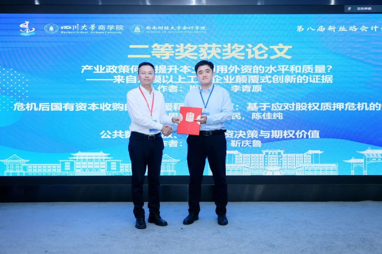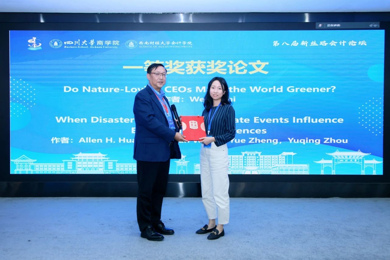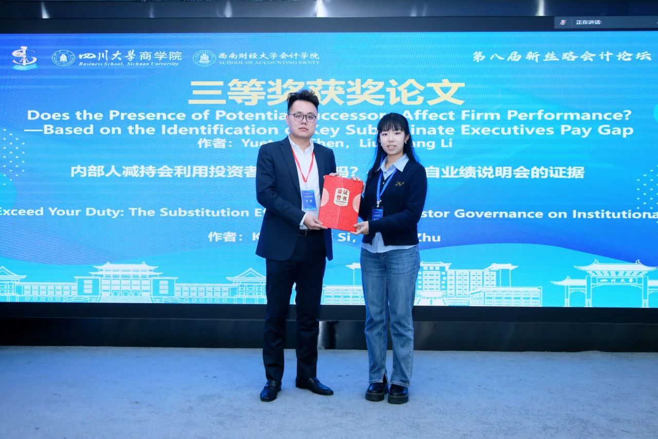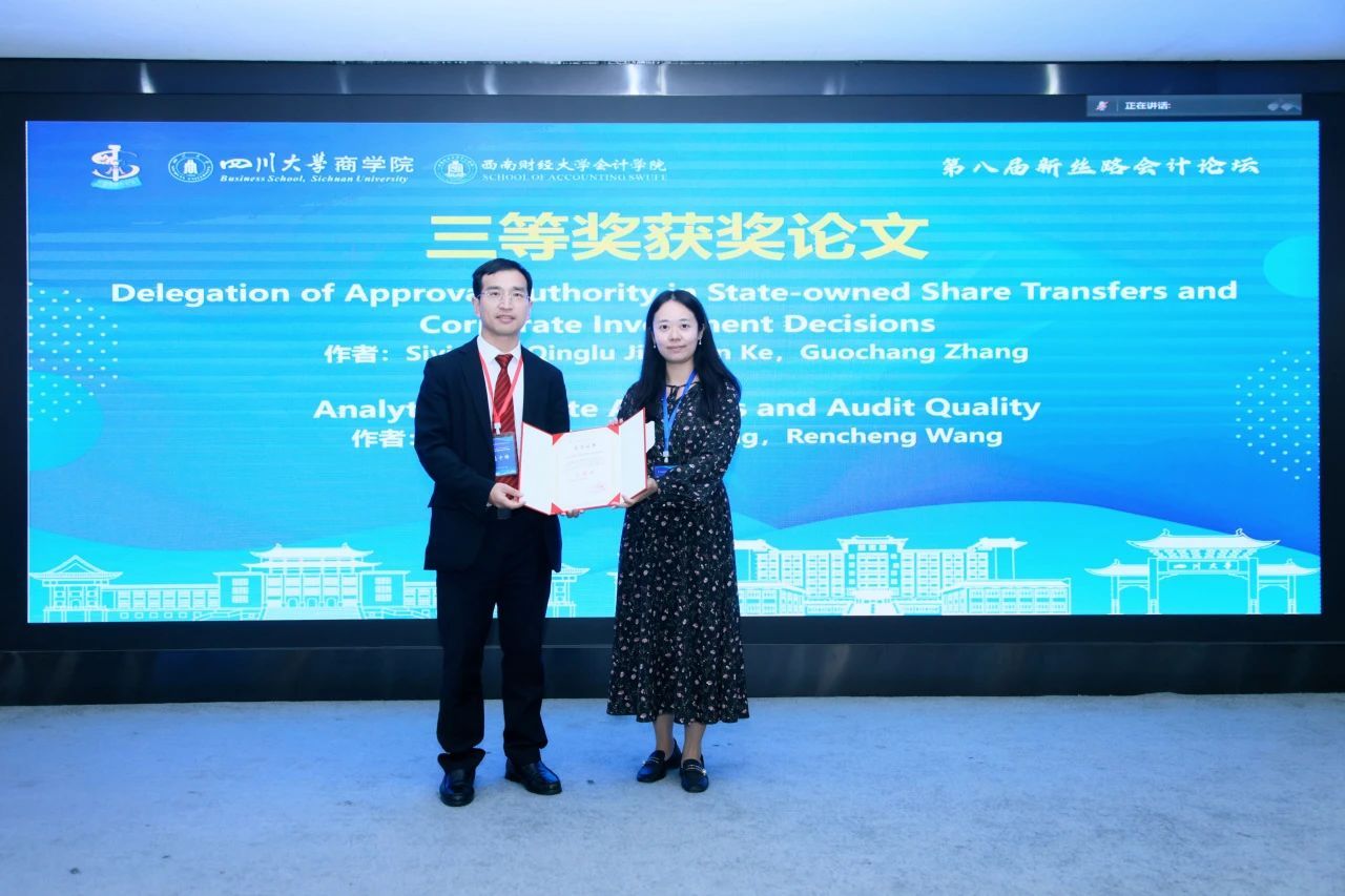 论坛还举行了优秀论文颁奖仪式,石劲教授、唐雪松教授、李贺教授、应千伟教授等嘉宾为获奖论文代表颁发了荣誉证书。本届论坛共评选出2个一等奖、3个二等奖和5个三等奖,充分展示了会计学界的研究成果与学术风采。
