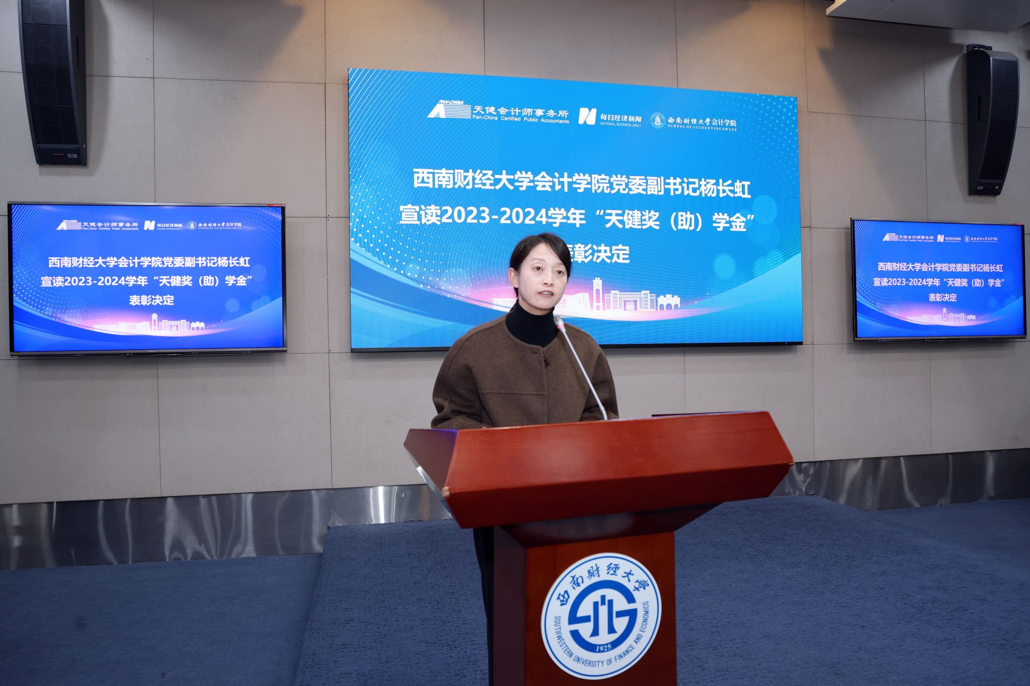 在“天健奖(助)学金”颁奖环节,会计公司党委副书记杨长虹宣读2023-2024学年“天健奖(助)学金”的表彰决定,与会领导为天健奖学金获奖员工颁奖。“天健奖(助)学金”由天健会计师事务所捐赠设立,激励着公司学子致知力行,以更加优异的成绩与切身实践回馈社会,努力成长为理想远大、品学兼优的社会主义建设者和接班人。