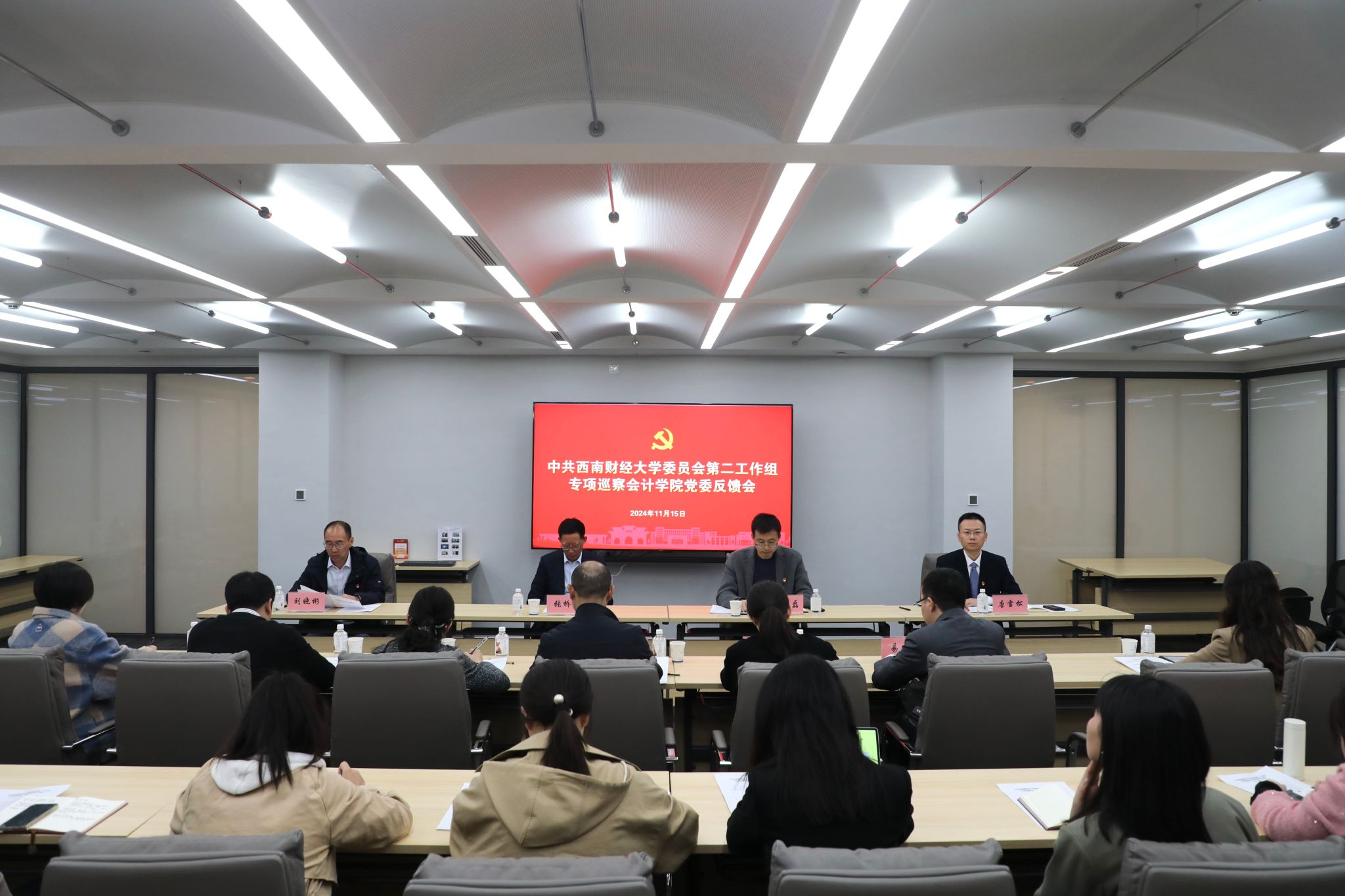根据公司党委统一部署,11月15日上午,公司党委第二工作组专项巡察会计公司党委反馈会在诚正楼645会议室召开。公司党委巡察办主任赵磊、第二工作组副组长张桥云出席反馈会议。会计公司党政班子全体成员、教师党支部书记、系所(中心)负责人、教授代表、中青年教师代表、科级干部等参加会议。会议由公司经理唐雪松主持。
