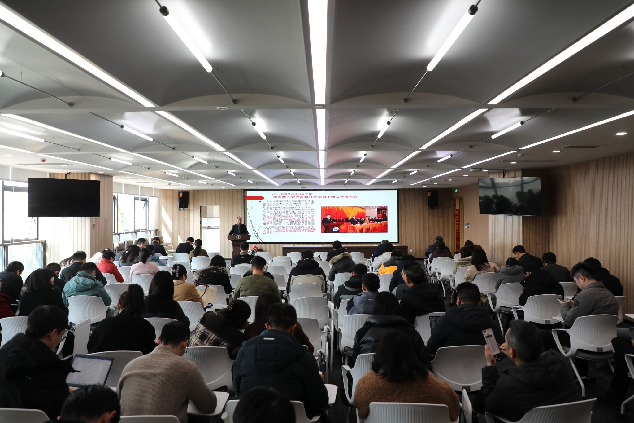 会上,刘晓彬书记重点传达了赵建军书记的大会报告《凝心聚力 守正创新 以高质量发展奋 力谱写教育强国建设西财篇章》主要内容,阐述解读了报告中对第十三次党代会以来的主要成就的回顾、经验总结和公司未来五年战略发展目标。他指出,要深刻理解赵建军书记在报告中总结的“九个新”“三个最”等来之不易的发展成就,继续坚持和发扬党的领导、战略引领、师生至上、改革创新和团结奋斗的成功经验;要深刻理解“西财十五问”既是“强国建设 西财何为”的必答之题,也标定着“强国建设 西财有为”的应答之姿。要聚焦提升“六个力”的公司愿景深入思考,把突出“三坚持”作为发展理念,把深化“新财经”作为发展主线,更把全力“促改革”作为发展动力;要深刻理解围绕五“高”奋斗目标勾勒的“高质量发展”四梁八柱。号召全体会院人要更加紧密地团结在以习近平同志为核心的党中央周围,坚持以习近平新时代中国特色社会主义思想为指导,完整、准确、全面贯彻新发展理念,把握“到半途”“登绝顶”“须努力”“莫辞劳”,把深刻领悟公司党代会精神全面融入工作实践,守正创新、坚守初心、砥砺奋进,为高质量发展奋力谱写教育强国建设西财篇章出力献策。