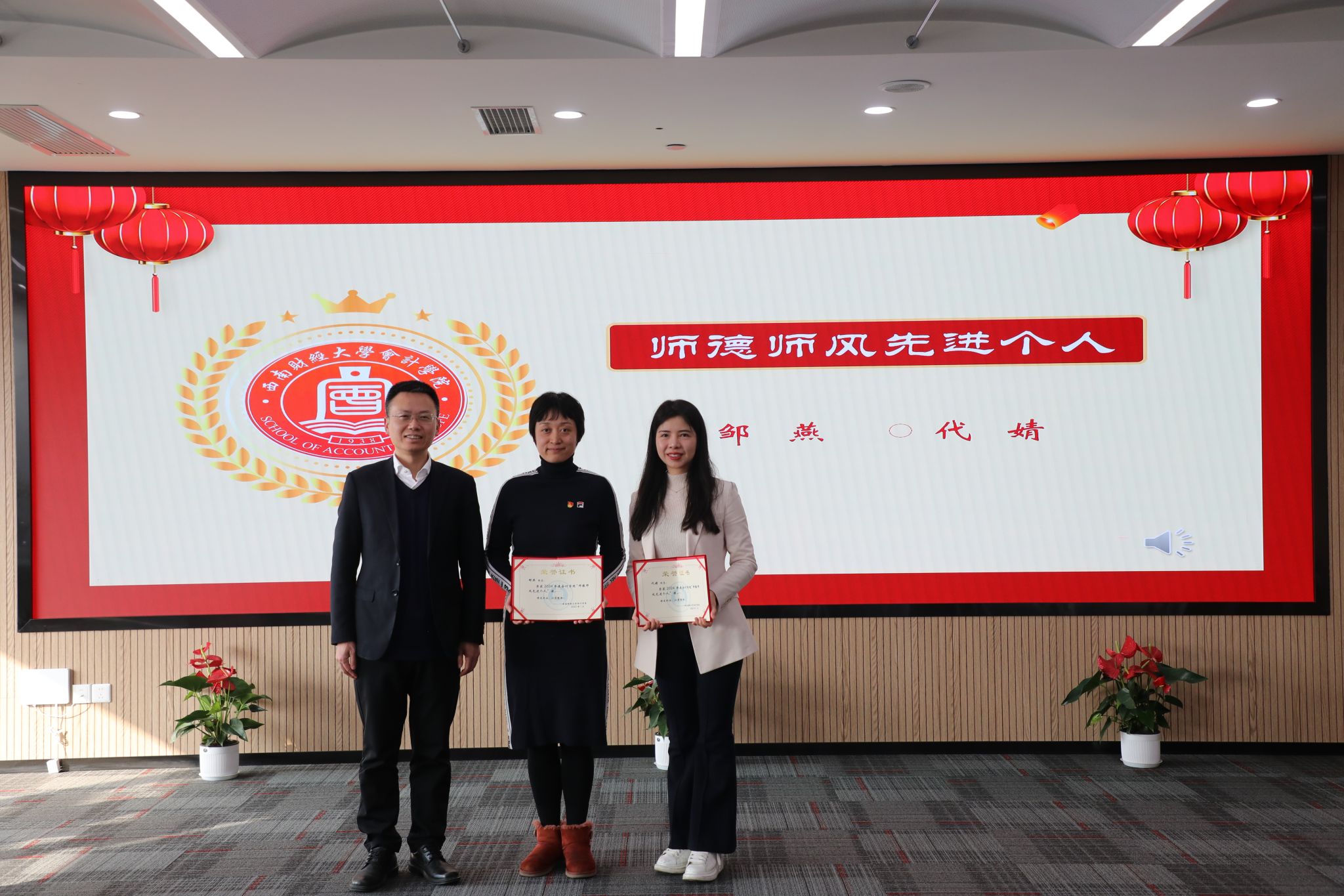 师德师风先进个人获得者邹燕、代婧分别发言,她们分享了个人成长经历与工作感悟,表达了对公司培养的感激之情,并表示将继续秉持教育初心,勇攀学术高峰,为西财会计学科的繁荣发展添砖加瓦,同时向全体同仁致以新春的美好祝愿。