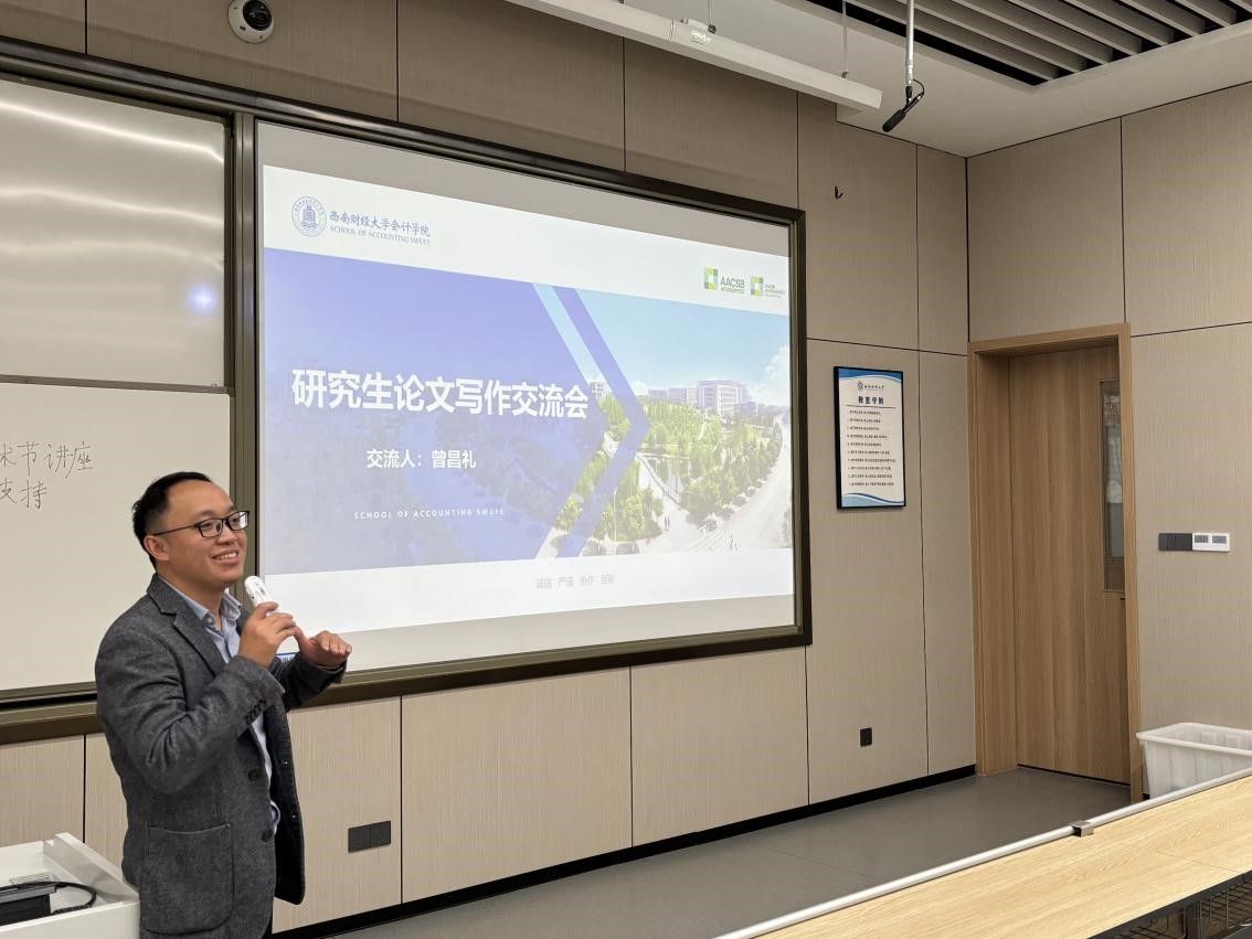 在实证研究论文写作的讲座中,曾昌礼老师结合自身研究领域从员工的实际需求出发,展开“实证研究论文写作”主题分享。他先梳理了实证研究的核心逻辑,重点讲解了“选择研究问题”的关键要点——包括规避范围过大、缺乏数据支撑等误区,以及通过视角创新、方法创新提升研究价值的路径。曾老师以期刊论文、科硕及专硕毕业论文为例,拆解了不同类型论文的基本结构,从摘要撰写、文献回顾到研究设计、实证结果分析,逐一明确规范要求,并结合自身主持国家自然科学基金、担任权威期刊匿名审稿人的经验,强调高质量文献引用与严谨数据论证的重要性。同时也鼓励同学们主动与导师交流,将所学方法应用于实际研究。
