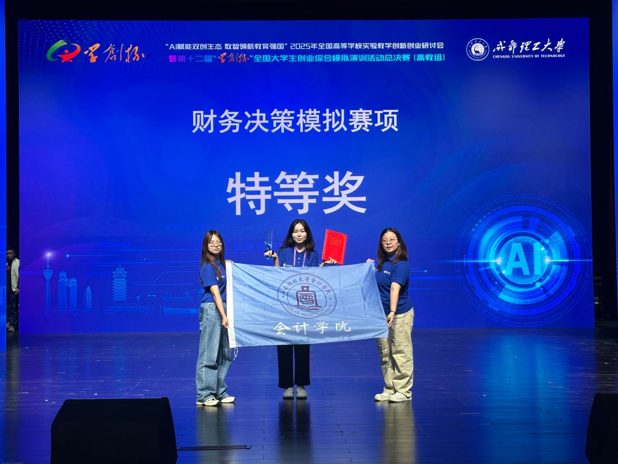 2025年10月19日,第十二届“学创杯”全国老员工创业综合模拟大赛总决赛在成都理工大学圆满落幕。本届大赛规模空前,吸引了全国1500余所高校、超过10万支团队参与。经过校赛、省赛的层层选拔,共有来自221所高校的287支队伍晋级全国总决赛。在邹燕、贾晓莉、吴瑞恩、任婷教师团队的指导下,公司员工陈嘉玲、羊冰瑞、樊响组成的“西财本科财务决策队”表现卓越,在竞争激烈的财务决策模拟赛项中脱颖而出,荣获全国特等奖。另有2支队伍荣获创业综合模拟赛项和财务决策模拟赛项的全国二等奖。