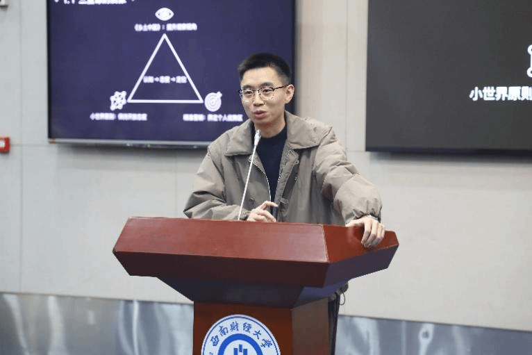 牟相学长结合自身经历,分享了自己在三门课程中的收获与启发:《乡土中国》筑牢通识认知,“小世界原则”教会开放心态,精准营销课程助力界定个人优势。他强调“要自己去尝试而非盲从”,鼓励同学们将课堂与活动转化为成长契机。结合自习室与校车调研实践,他谈到员工工作的核心是为同学服务,意义感源于个人追求与环境的共同作用,而丰富实践正是个人魅力的重要来源。