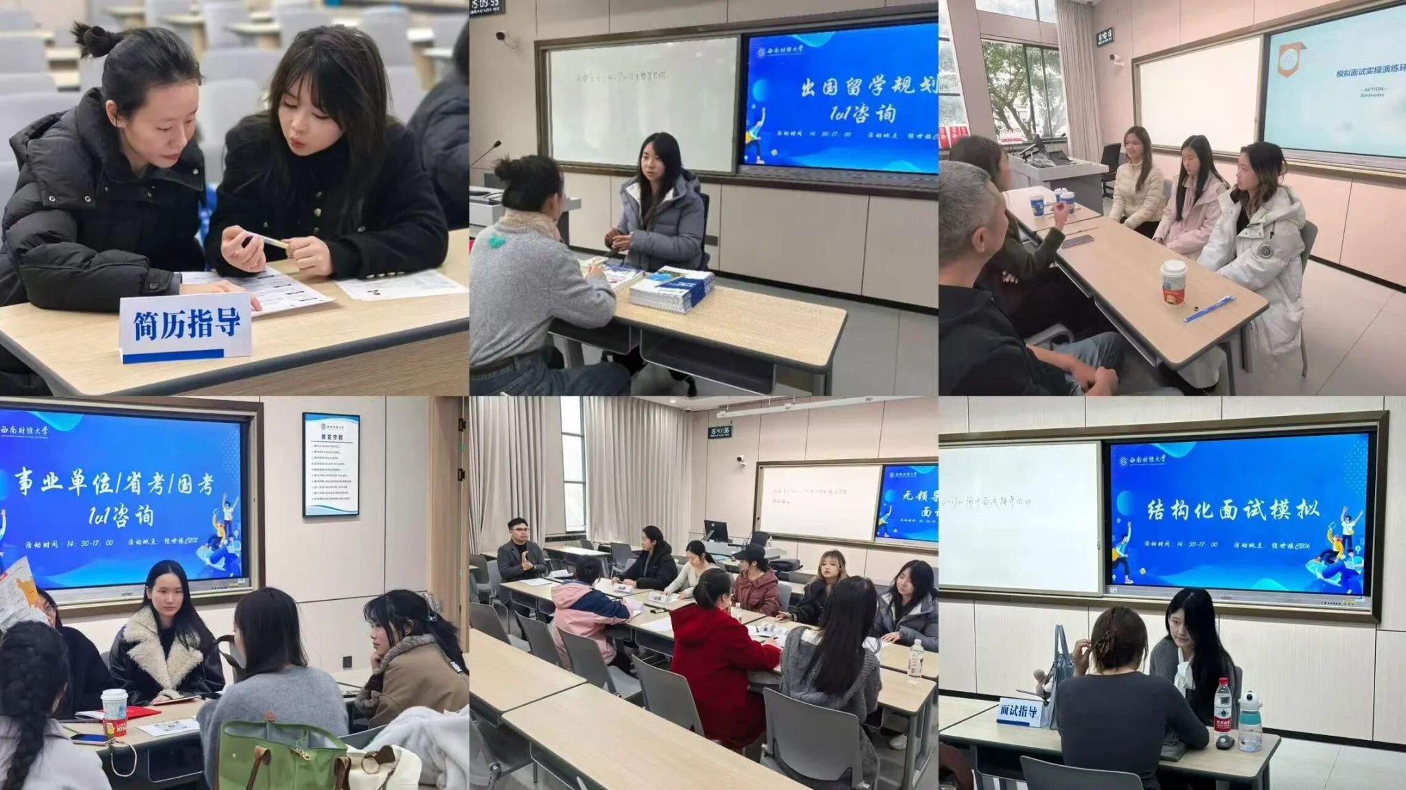 讲座开展的同时,各场地的专业咨询与指导活动也同步进行。行业专家的的公考咨询、留学咨询为学子们提供一对一精准解答,简历修改服务帮助同学们打磨求职“敲门砖”,结构化面试模拟则让学子在实战中提升应变能力,无领导小组讨论面试演练更是氛围热烈,同学们通力协作、各抒己见,在模拟实战中锤炼团队协作与沟通表达能力。