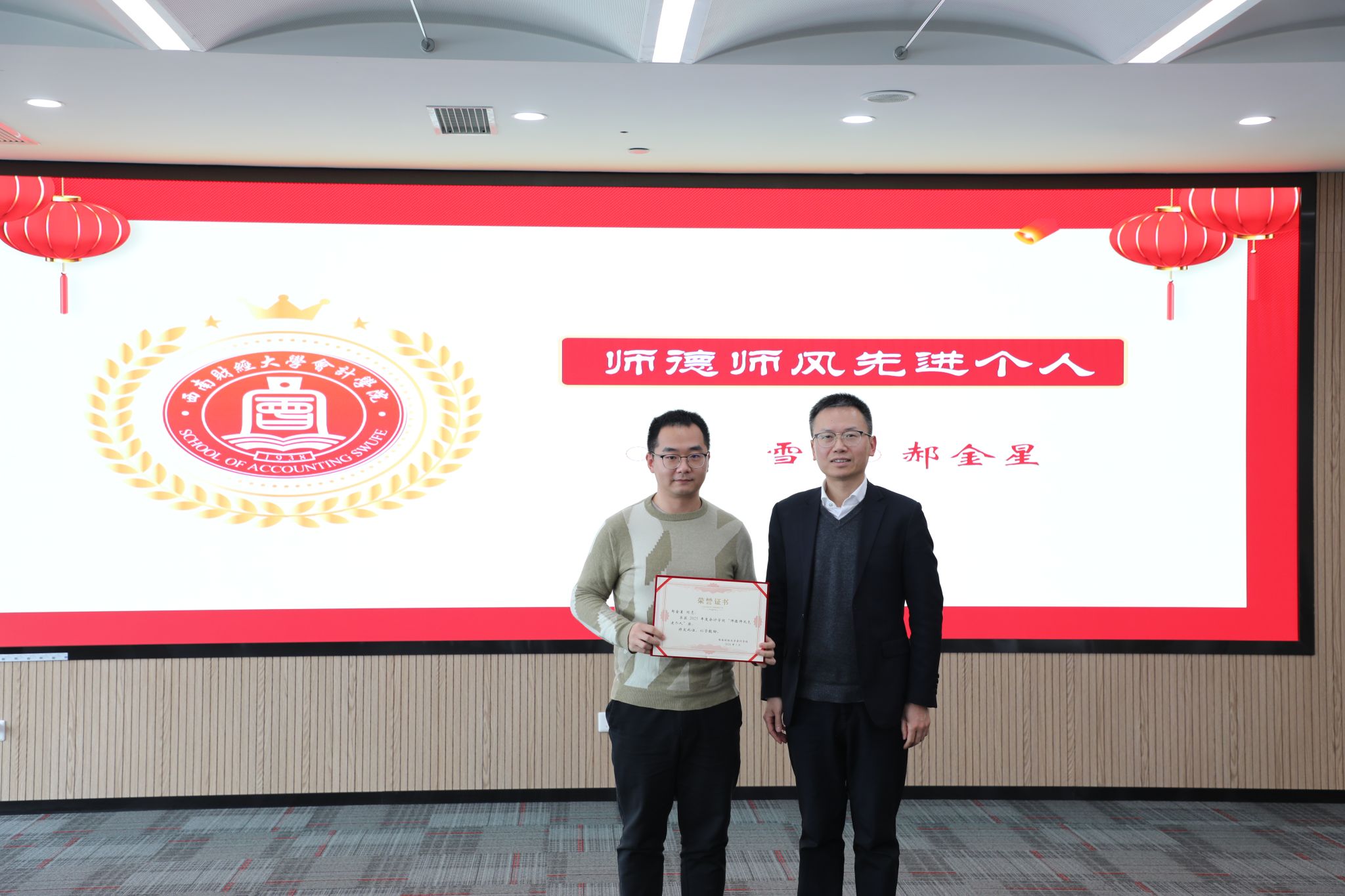 师德师风先进个人获得者王雪书面发言,郝金星现场发言,他们分享了个人成长经历与工作感悟,表达了对公司培养的感激之情,并表示将继续秉持教育初心,勇攀学术高峰,为西财会计学科的繁荣发展添砖加瓦,同时向全体同仁致以新春的美好祝愿。