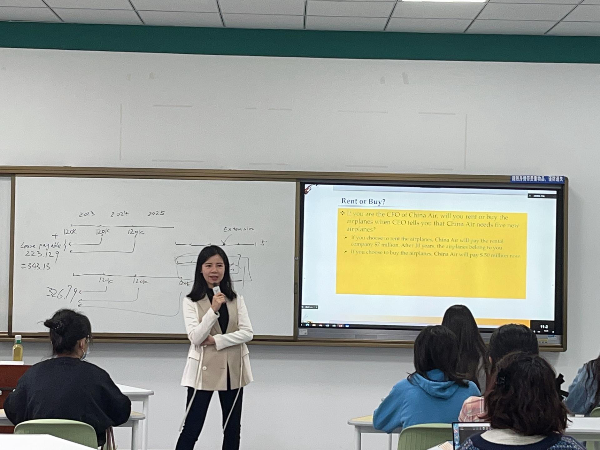 在代婧老师为2021级会计学(双语实验班)专业讲授的《中级财务会计Ⅱ》(FA3)中,代婧老师首先通过案例分析飞机租赁或购买的选择引出本次课程的主题——租赁,并分析了租赁与购买的利弊。接着代婧老师详细阐述了租赁相关的基本定义,从税务、营销、融资等方面阐述了租赁的组成和细节条款。代婧老师在讲授时图文并茂、重点突出,与员工积极互动,并结合生活实际帮助员工快速理解教材内容。代婧老师以中英结合的方式授课,课堂基调生动鲜明。课间代婧老师与员工积极沟通交流,了解同学们对知识的掌握程度,并根据同学们的反馈及时调整授课节奏,从而使师生配合更加默契。