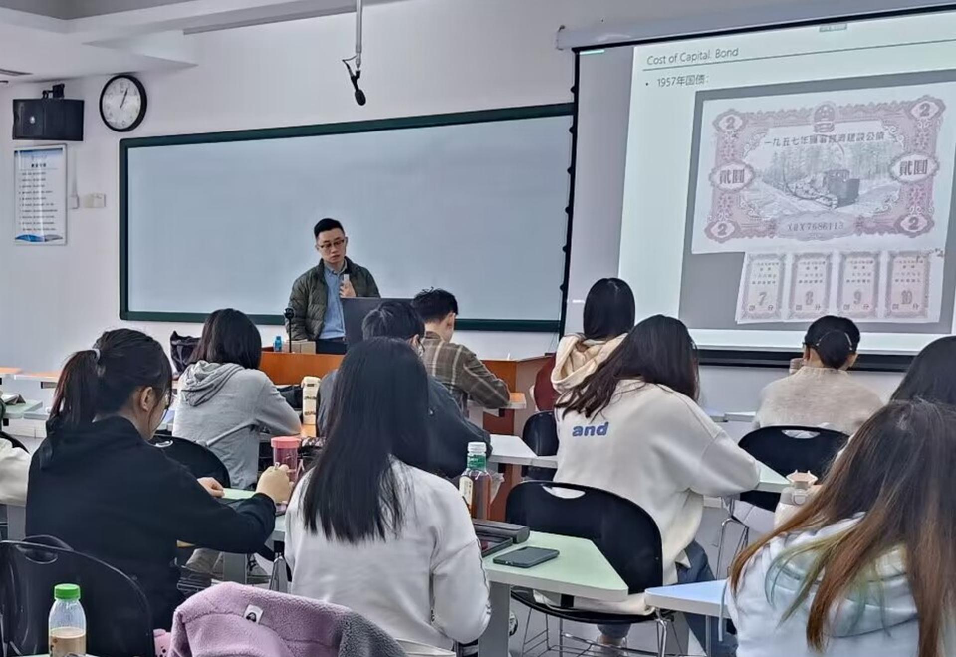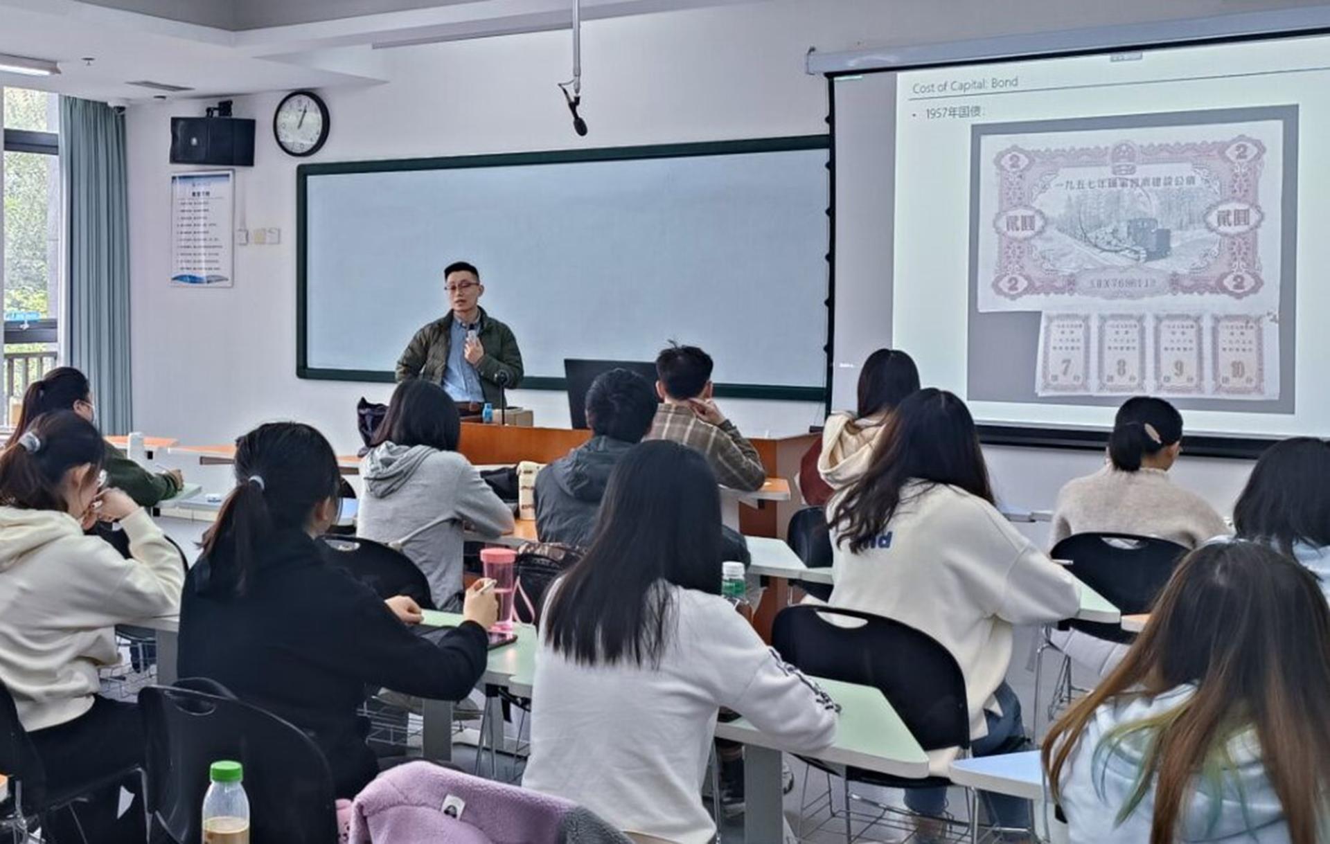 在屠致远老师为2020级会计学(双语实验班)专业教授的高级财务管理(FN2.英文)课堂中,他首先带领同学们回顾了资本成本的知识,以幽默风趣的教学形式活跃了课堂氛围。随后屠老师以1957年的国债图片引入了计息周期、票息率等课堂重点内容。屠老师没有拘泥于课本的局限,而是通过讲述中国近现代历史的发展引导员工对国债产生的背景有了深层次的认识。此外,屠老师以娴熟的双语教学着重讲解了如何确定债券的资本成本,并引入插值法,辅以具体公司的案例讲解,从而帮助同学们更好地理解课堂内容。