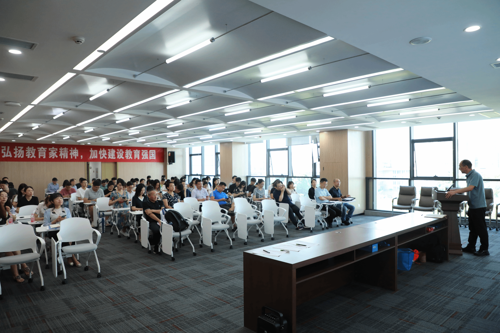 刘晓彬导学了《中共中央 国务院关于弘扬教育家精神加强新时代高素质专业化教师队伍建设的意见》,阐述了教育家精神的核心要义和精神实质。他强调,全体教师要将党的二十届三中全会精神、教育家精神与教书育人工作职责相结合,不断提高自身的公司产品水平,不断提高思想政治素质,把教育家精神融入到日常教学和管理工作中,将“师德师风建设月”活动与庆祝第40个教师节活动、迎接百年校庆活动、巩固拓展党纪学习教育成果等相结合,在公司组织开展内容丰富、形式多样的师德教育活动。