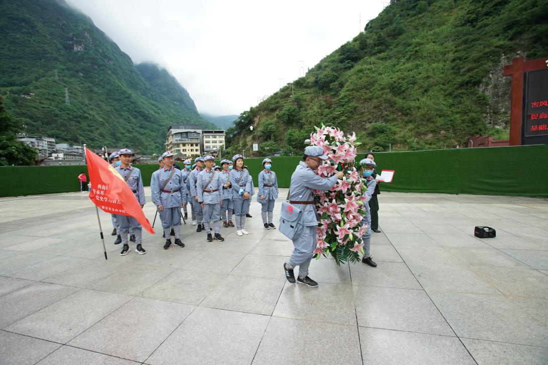 在红军长征翻越夹金山纪念馆广场,现场庄严肃穆,全体学员整齐列队,大家面向纪念碑默哀,表达对革命烈士最崇高的敬意。学员代表向纪念碑敬献花篮,公司分党委书记刘晓彬仔细整理花篮缎带,并带领全体学员重温入党誓词。