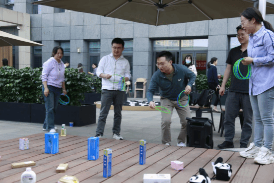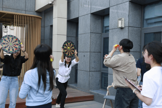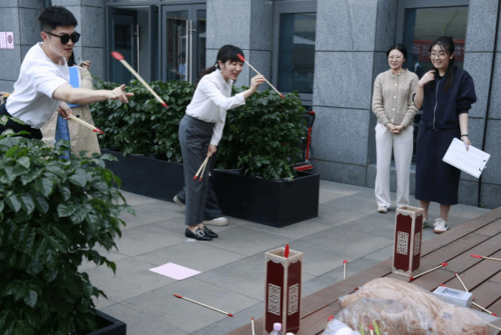 紧接着进入了最激动人心的环节——游园会,游园会共设置三个项目,投壶,套圈和双人飞镖。投壶项目考验大家的技巧,手感火热的老师连中三元。套圈项目需要老师沉着冷静,仔细思考合理取舍,许多老师都套中了心仪的礼物。双人飞镖则更考验默契,老师两人一组,一人蒙眼扔飞镖,一人拿盘接飞镖,配合精准方能决胜。老师们在各个环节各显神通,活动现场氛围高涨,欢笑连连。