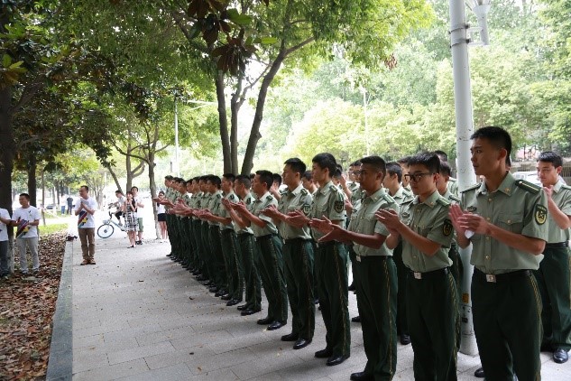 座谈会结束后,大家来到K1体育楼下的“曹顿山纪念树”下,举行缅怀曹顿山烈士捐赠纪念碑石活动,由员工郝琨主持。刘晓彬书记代表公司对员工们此次捐赠的立意表示高度的赞赏和衷心的感谢,他回顾了国防班专业的历史,感谢国防班学子们在祖国国防战线上所做出的系列成绩;回顾了曹顿山同学在校期间在社会服务方面的突出表现及之后的英雄事迹,希望在校生们向其学习,用青春真正去践行“大气为人,大智谋事,大爱行天下”的西财青年品格。接着,刘晓彬书记、孙开健与方萍老师一同为碑石揭幕,2004级国防班员工代表和2014级国防班员工代表一起为曹顿山烈士献上鲜花,代表着国防班十届的精神传承。2014级国防班员工代表张科亮发言,表示一定会追寻曹顿山学长及各位优秀学长的步伐,牢记自己是西财国防生的身份,真正做到心中有他人,胸中有使命,为母校争光,为西财国防生争光,为祖国的国防事业献出自己的全部力量。最后,即将毕业、穿上戎装的2014级国防班员工在碑石前、在学长与战友们的见证下,发出了坚定洪亮的宣誓,表明了他们的决心和信念。本次活动在“忠于人民,报效国家,献身使命,崇尚荣誉”的铮铮誓言中圆满落下帷幕。