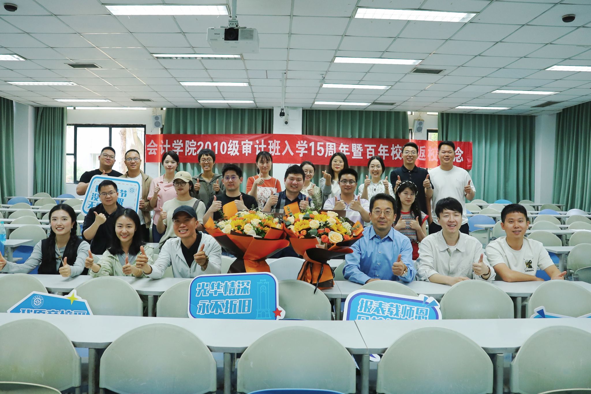 下午,员工们与教师代表张力老师、2010级审计学辅导员何振雄老师在经世楼F104欢聚。2024级CPA专业的员工代表首先和学长学姐们做了互动交流,并为学长学姐们献唱了他们当年毕业道别合唱的歌曲《时间煮雨》,并表演了欢迎歌舞。员工们围坐在一起,翻看一张张泛黄的老照片,曾经充满激情与梦想的青春岁月仿佛就在眼前——有人谈起选课时的趣事,引得全场笑声连连;有人感慨如果能回到十年前,一定要更加珍惜学习时光;还有人谈及健康与家庭的重要性,言语间流露出对生活的深刻理解。当回忆涌上心头,不少员工眼眶湿润,现场氛围温馨而感人。同学们亲切互动、畅谈心声,分享了各自的工作经历、生活感悟以及对母校和同学的思念之情。老师们也深情回忆了当年一幕幕难忘的画面,更是欣喜地见证了同学们的成长和蜕变。尽管岁月流逝,当年的同窗情谊依旧深厚。无论是曾经在舞台上挥洒汗水的日子,还是自习室里夜以继日的努力,大学时的点滴回忆都成为了大家珍藏的共同财富。最后,师生们共同合影留念,用镜头定格下这难忘的时刻,也寄托了对母校百年华诞的深情祝福。