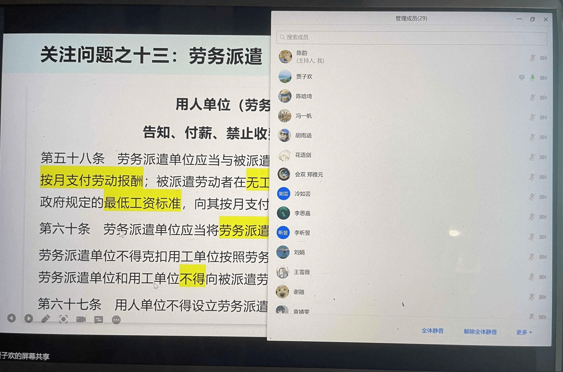 贾子欢老师在中华人民共和国劳动法的基础上进行剖析,简要讲解了十三章要点,让同学们对劳动法拥有初步的了解。贾老师逐渐延伸细化到关于劳动合同法的问题上,重点讲解了关于劳动合同法的十四个最受关注的问题,诸如不签合同、试用期、保密协议、竞业限制等,并用生动的案例来进行说明和重点标注,对十四个问题都进行了深度的阐述。如在提及试用期法律问题时,贾老师强调试用期包含在劳动合同期限内,劳动合同仅约定试用期的,试用期不成立,该期限为劳动合同期限。为了加深同学们对相关知识点的理解,贾老师进行了场景演绎,模拟了一个女职工的职场生涯,分别为入职、职场日常、生育、退休四个阶段。分享中还一一解答了同学提出的问题,提出了自己的见解思考。