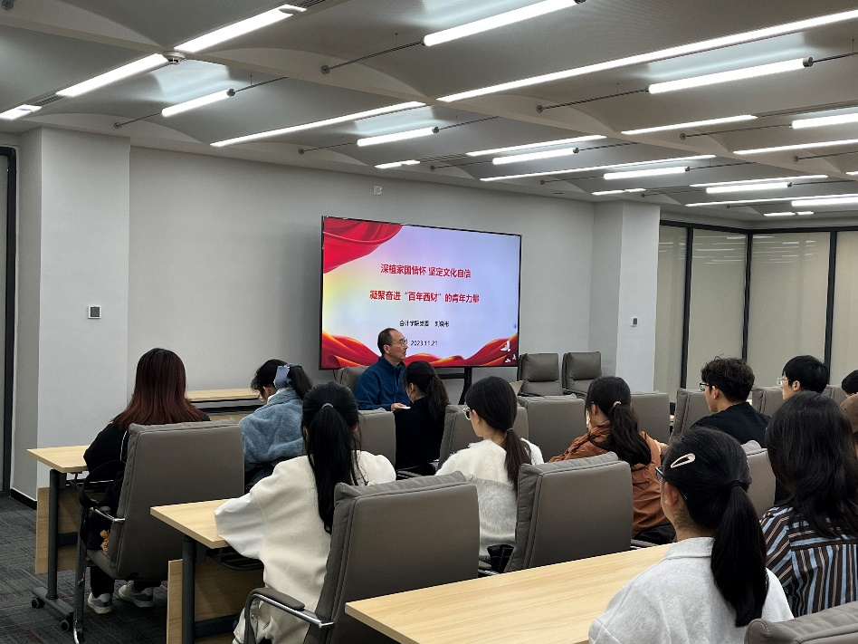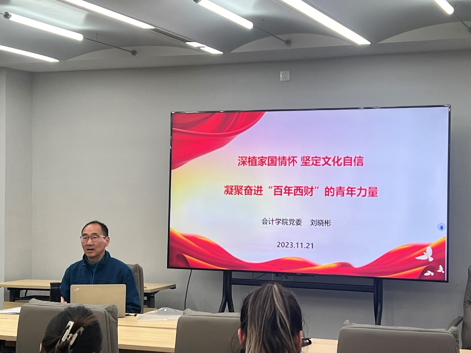 11月21日下午,K1体育于诚正楼650会议室举办了“思政大讲坛”第二十期之“深植家国情怀,坚定文化自信,凝聚奋进‘百年西财’的青年力量”思政课,本次活动邀请到了会计公司党委书记刘晓彬主讲。
