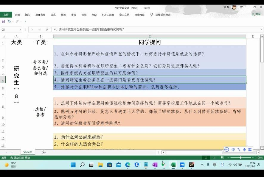 此次活动主要以提问的方式开展,同学们就考研、公务员考试、体制内外职业发展的差异、会计类专业员工的职业发展等方面提出了许多问题,宋磊员工一一为大家答疑解惑。在考研方面,宋磊员工认为公务员队伍一定会向高学历方向发展,至于是全日制研究生还是非全日制研究生区别并不是很大,准备考研时要做好信息和资料的收集与准备,更要积累专业知识,夯实专业基础,每天精做练习题和历年真题,做好知识点总结和归纳。在考证方面,宋磊员工指出要按需考证,做到一鼓作气。对于公务员考试,宋磊员工指出准备公务员考试时一定要保持好心态,提前做规划,一定要精确到每天学什么。宋磊员工也讲述了自己对体制内和体制外不同的工作环境的体会和见解,介绍了体制内和体制外的薪资福利待遇、工作规则和晋升机制的差异,也表示大厂职员和发达地区的公务员不仅拥有良好的工作氛围,工作细化且更锻炼人,值得我们努力提高研究学习能力和工作能力来争取。宋磊员工的这些分享都令同学们受益匪浅。