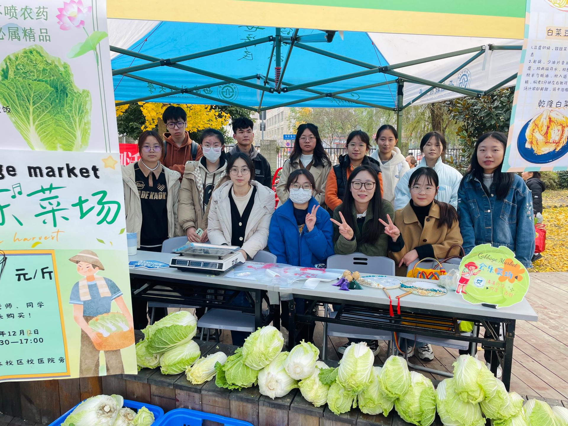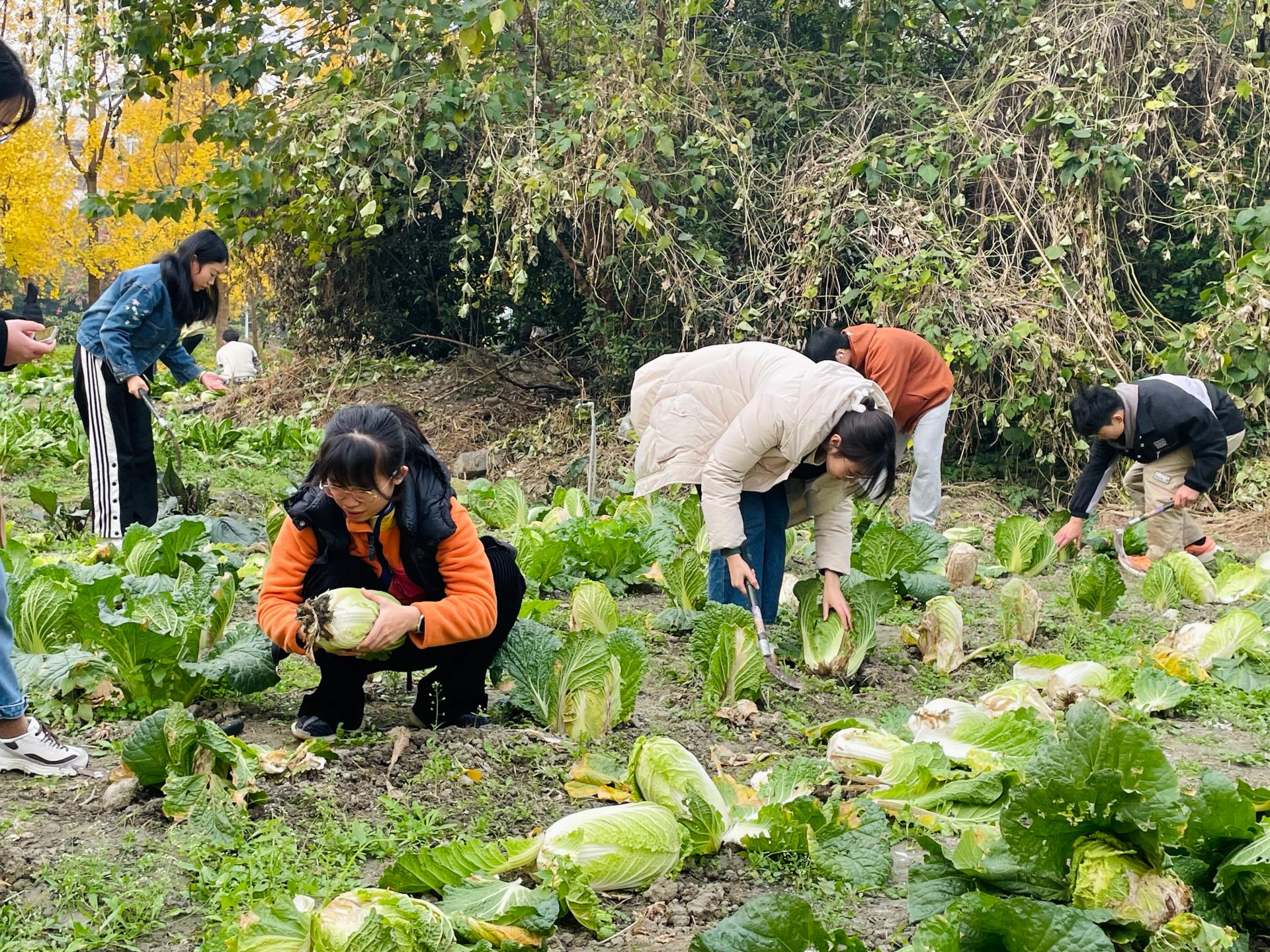 集中采摘活动开展之际,同学们齐聚会乐园地,在老师的指导下,如火如荼但有条不紊地进行着大白菜的采摘。从拔出白菜到为白菜去除烂叶,同学们乐此不疲。迅速完成采摘后,大家将收获的多筐白菜搬运到实践基地,热情地向老师同学们推销自己的劳动成果,大家共享着劳动带来的快乐。同学们自产自销的健康又营养的白菜也收获了老师同学们的广泛支持与好评。最终,白菜顺利售完,老师们满载而归,“耕读田园”的同学们也收获了劳动与丰收带来的喜悦与成就感。