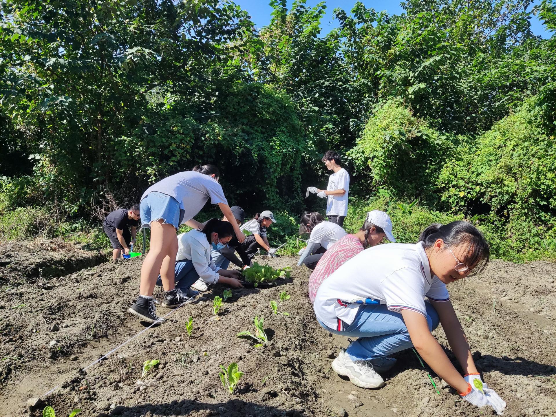 同学们拿起锄头,干劲十足,在后勤老师的指导下,拉线划区,松土拔草,顶着烈日把原本荒芜凌乱的地块整理成了五块整齐的区域,四周的杂草也被清理干净。准备工作完成之后,就开始栽种莲花白菜苗,小苗苗很容易被折断,同学们小心翼翼的起苗,用手的大拇指和食指捏住菜苗的根部,缓缓拔起,为提高树苗成活率还留下了原本培栽的泥土,所有的菜苗移栽成功之后,按照一瓢水三个苗的量为每一个菜苗浇水,让莲花白能够更加茁壮成长。