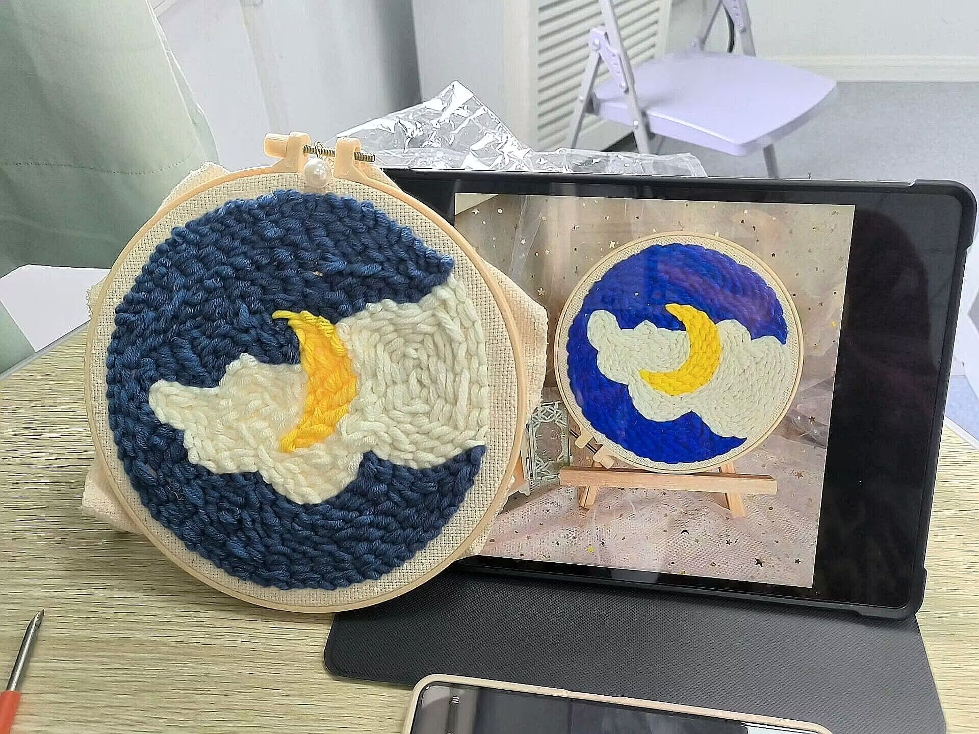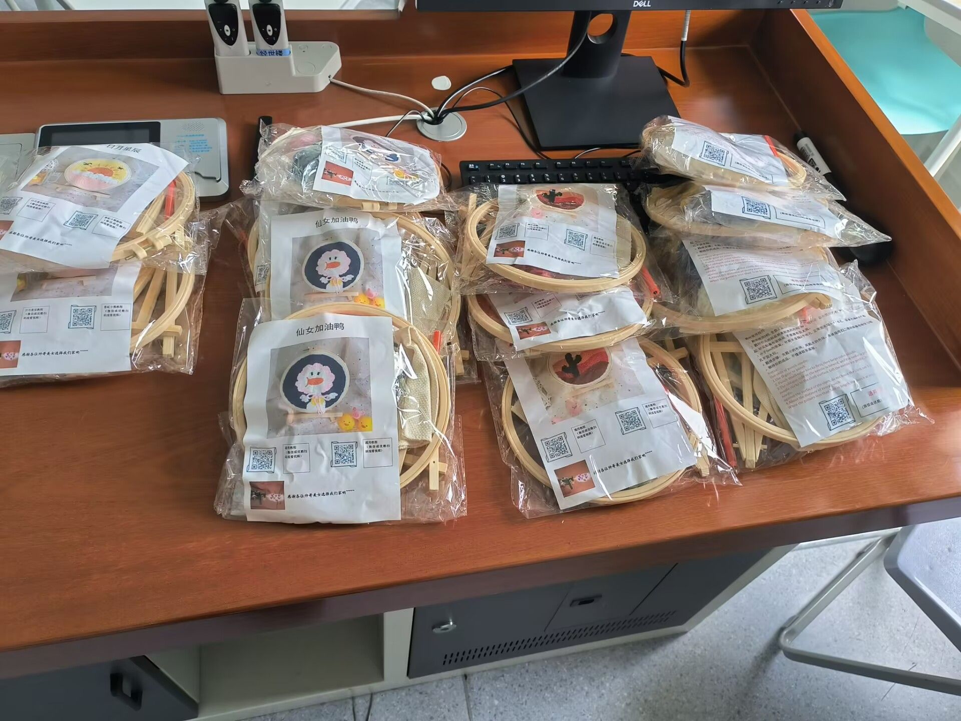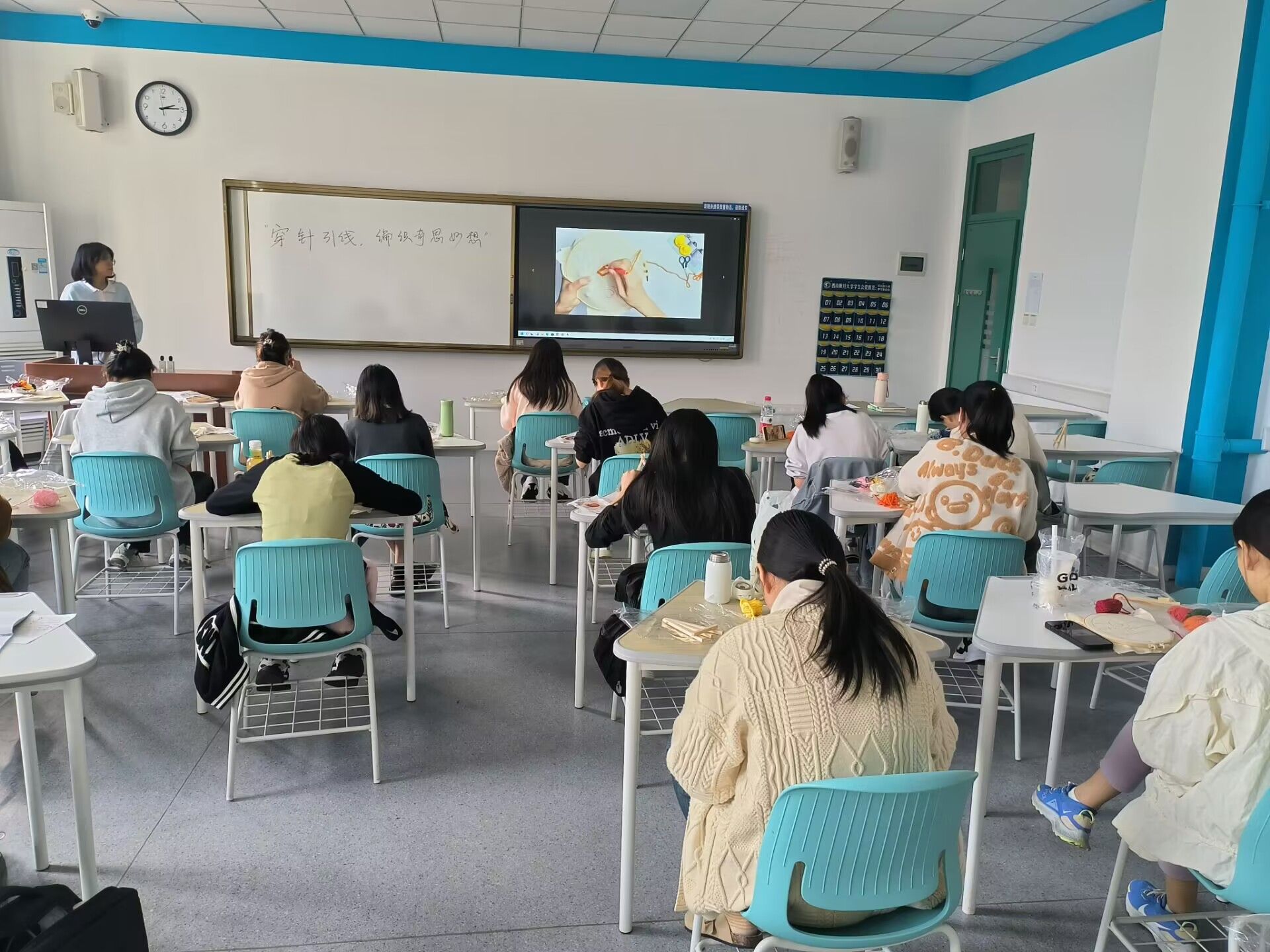 活动现场,色彩斑斓的“仙人掌”、 “日月星辰”等戳绣图案材料琳琅满目,不仅激发了同学们对美的无限遐想,也点燃了他们动手创作的热情。从精心挑选绣棚到细致观摩教学视频,每一位参与者都沉浸在自己的艺术世界里。随着指尖的灵活穿梭,一根根彩线仿佛被赋予了生命,它们交织缠绕,渐渐勾勒出一幅幅生动而富有创意的针织作品。