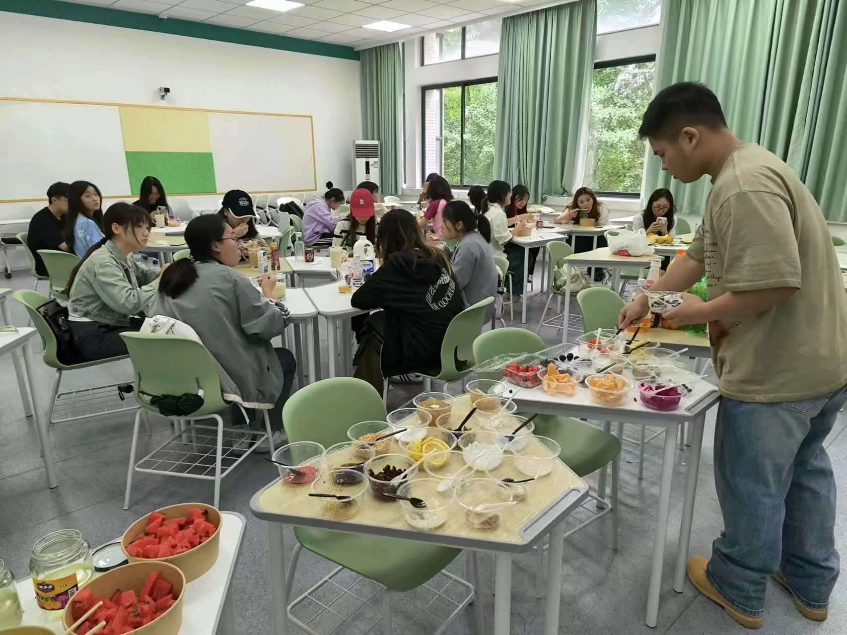 活动伊始,主持人首先为大家介绍了活动流程和规则,推荐了制作饮品时的食材搭配,并强调了相克的饮品。随后,同学们被引导至自制冰饮和水果捞的食材区,满怀期待地开始制作。丰富的原材料和制作工具,让同学们可以根据自己的口味和喜好,亲手调制出属于自己的夏日冰饮和水果捞。活动过程中,同学们尽情“创意创美”,使用新鲜果汁、奶昔、汽水等基底,搭配各种新鲜的水果与小料,调制出色彩缤纷、口感丰富的冰饮和营养美味的水果捞,收获了满满的幸福感与成就感。此外,活动现场还为大家准备了当前较为热门的电影,为同学们带来视觉和味觉的双重享受,为此次活动增添了不少乐趣和惊喜。