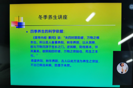 赵老师在讲座中从精神调养、饮食调养、起居保健、坚持运动、药物保健以及防病保健这六个方面,向同学们介绍了中医的基础理论、科学依据以及在冬季如何顺应气候变化保养身体,提升自身健康状况。许多同学也就老员工日常生活中常见的健康问题向老师求解,比如:如何养胃、防脱发、改善睡眠等,老师也就这些问题一一做了解答。