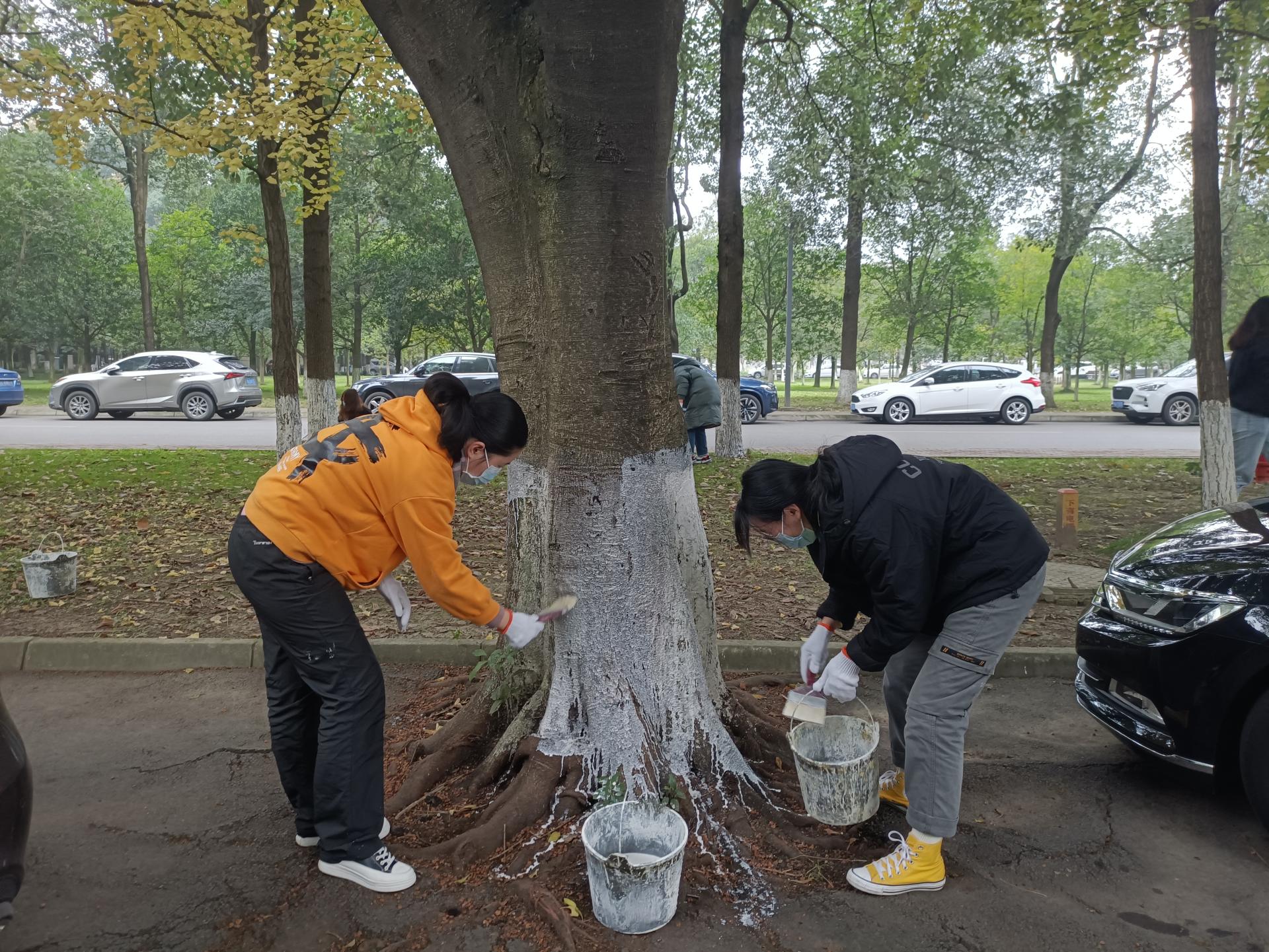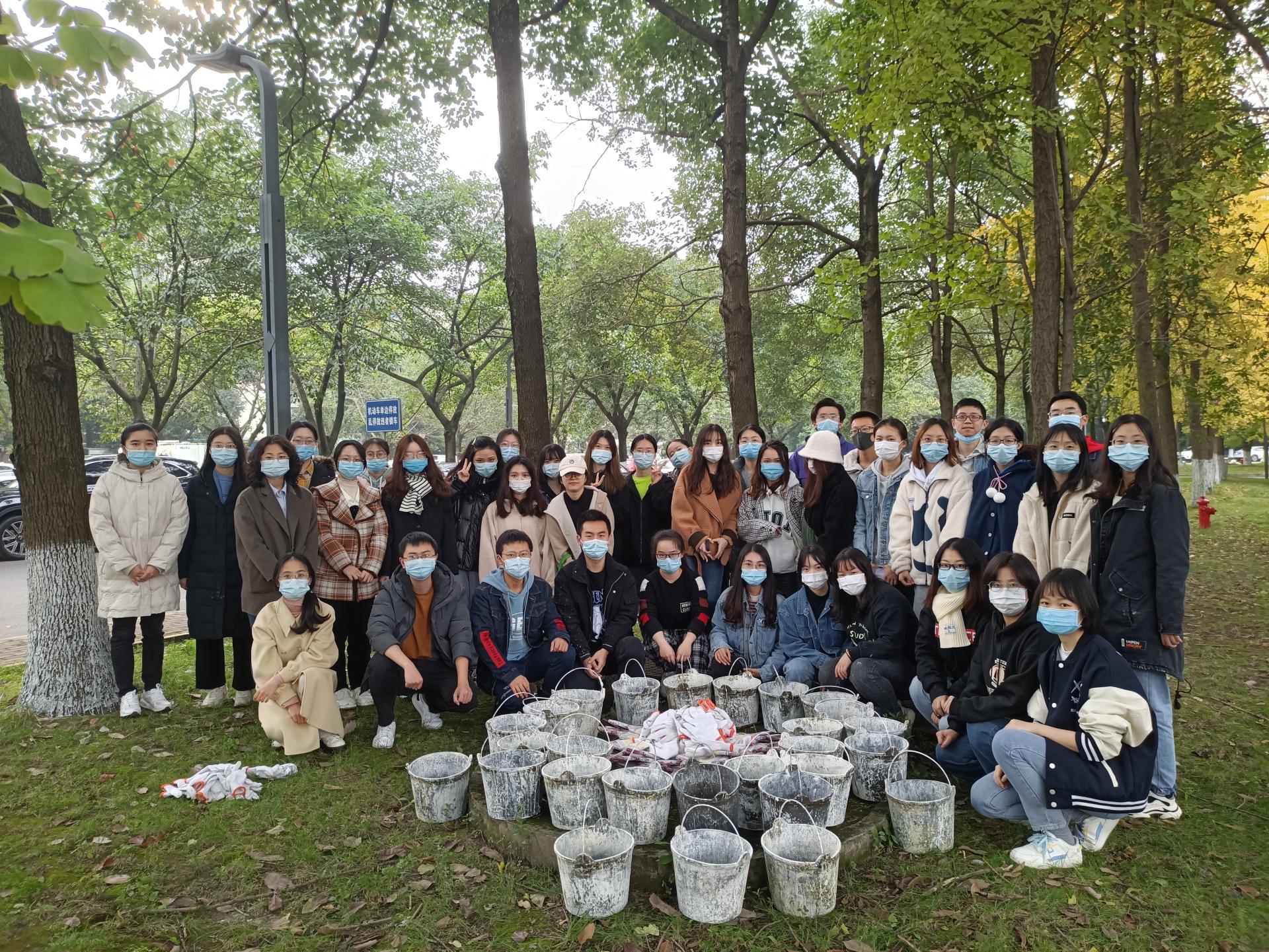 2021年11月19日上午,陈秋达老师带领2021级会计专硕三班员工在光华校区开展“树干涂白”冬季护树劳动实践活动。活动前,为达到整齐美观的涂白效果、起到良好的防病虫害作用,后勤工作人员向同学们讲解树干涂白方法及相关注意事项;同学们在专业人员现场指导下,将事先按照严格比例配置的涂白石灰,从根部对树进行均匀涂白,并在树皮缝隙、洞孔、树杈等处反复涂刷。劳动过程中气氛活跃,同学们不怕脏、不怕累,为校园树木穿上了御寒保暖、防虫杀菌的“保护衣”,在“树干涂白”活动结束后,同学们对涂白树木周边清扫整理,恢复了校园环境的干净整洁。