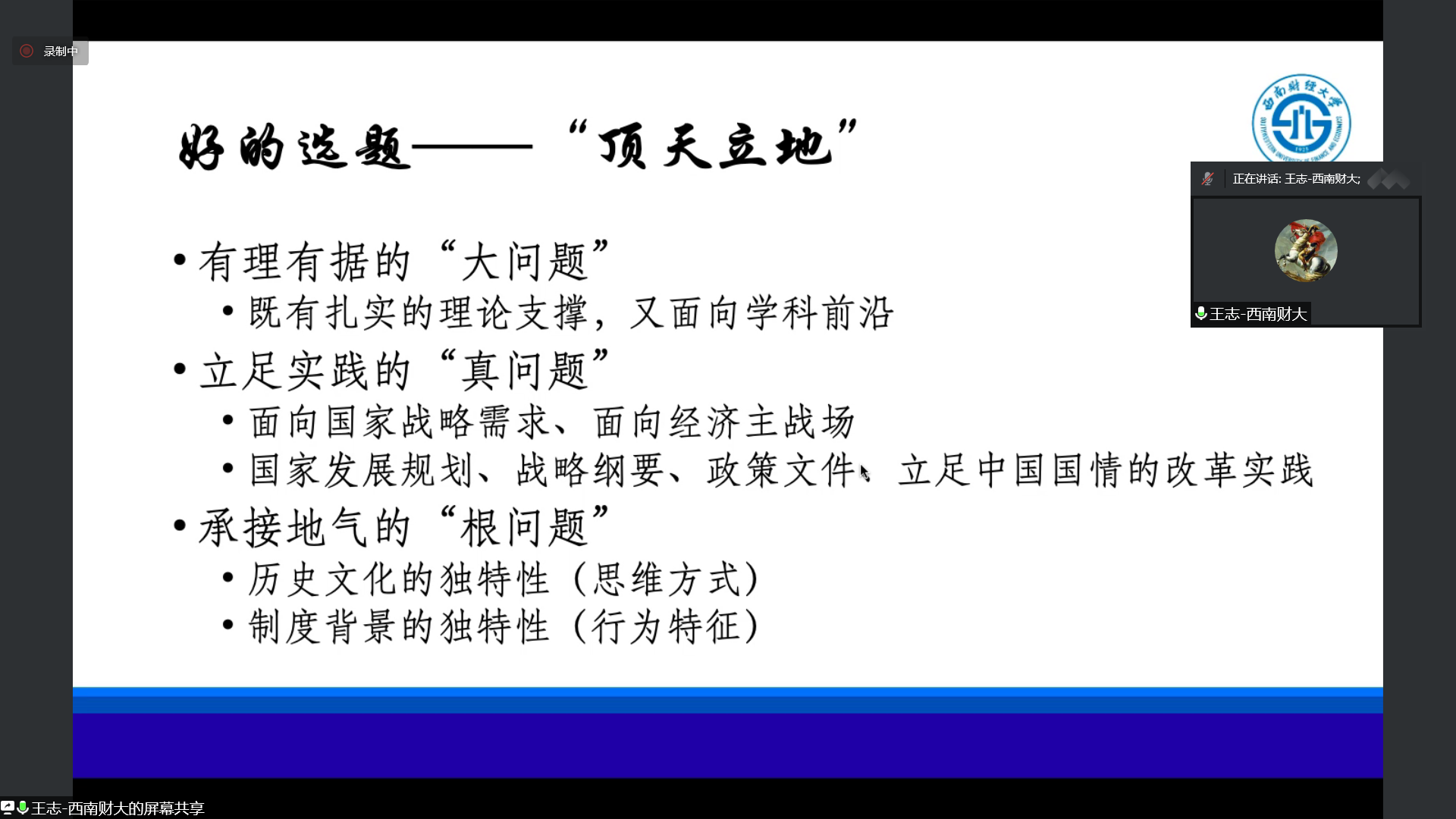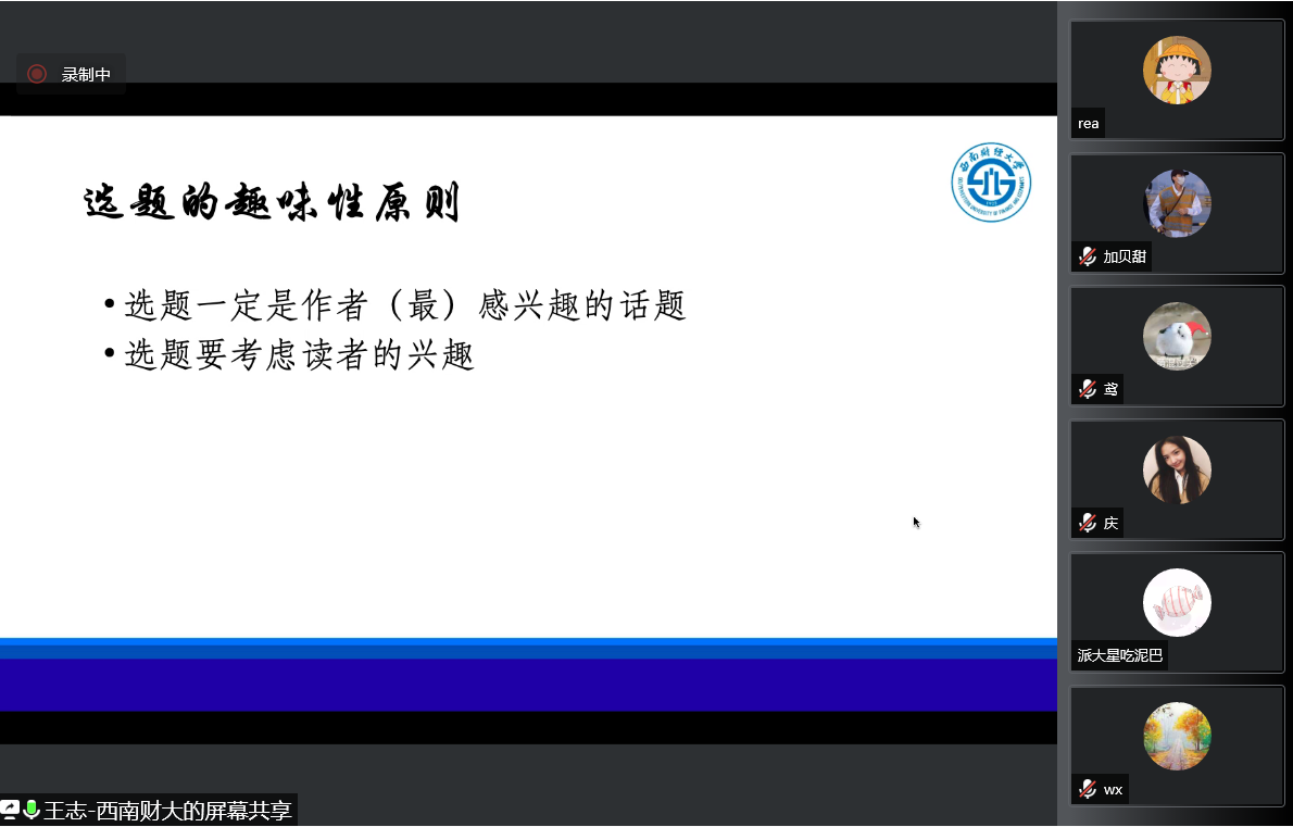 王老师以“什么才是好的选题”切入,引起同学们思考。随后开始介绍,真正好的选题应该是“顶天立地”的,何为顶天,何为立地?既要是有理有据的“大问题”,也要是立足实践的“真问题”,更要是承接地气的“根问题”,形象生动的讲法让同学们印象颇深。紧接着,他谈到了选题的重要性、相关性、拓展性、有界性等各项原则,让同学们在进行论文选题时有一定的方向,并通过这些原则来检查自己的选题是否恰当。其次,王老师向大家介绍了选题来源,概括下来即是学、思、践、悟。在文献阅读方面,他建议作为初学者应该多阅读综述性文献,若想进一步提升,可以自行阅读某一领域的主要论文,如一些高被引文献,并对该领域的文献进行综述来增强自己对该领域的认识。他表示,记下文献阅读中的心得体会,就是你自己的思想。
