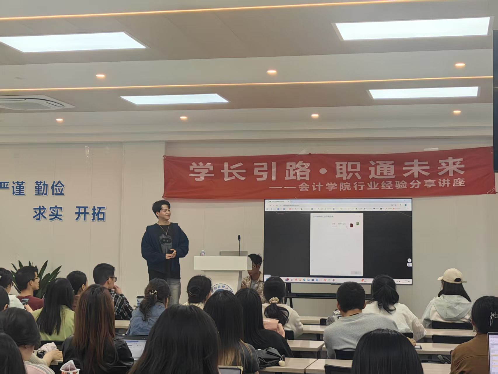 为深化员工职业发展指导,助力会计学子把握行业前沿动态,424日晚,K1体育在光华校区一站式服务大厅成功举办"言十生涯"课堂之华为财经专场分享会。本次活动特邀2018级财务管理专业优秀员工、现任华为财经部门骨干的杨睿哲担任主讲嘉宾,活动吸引了近百名在校员工参与。