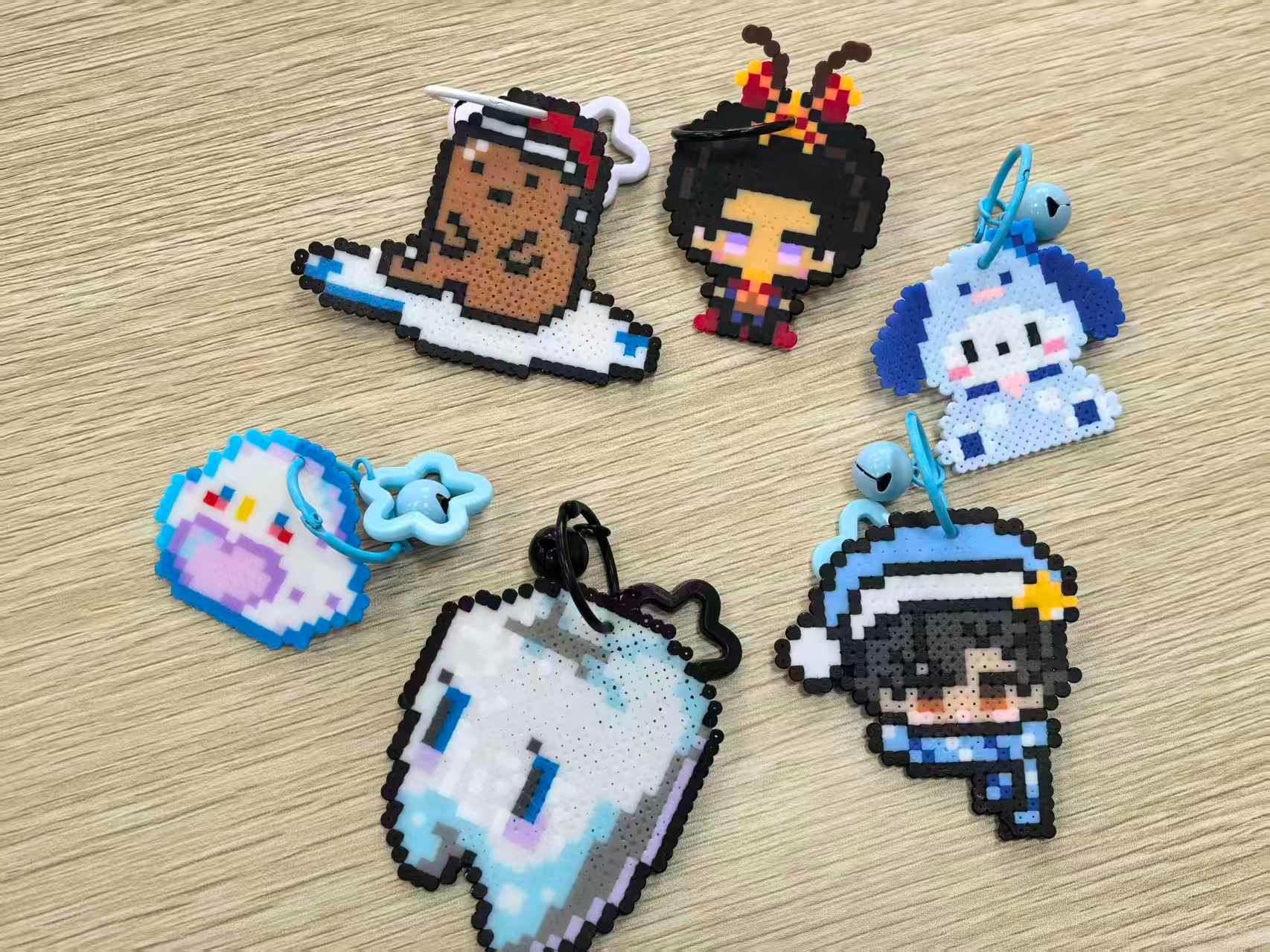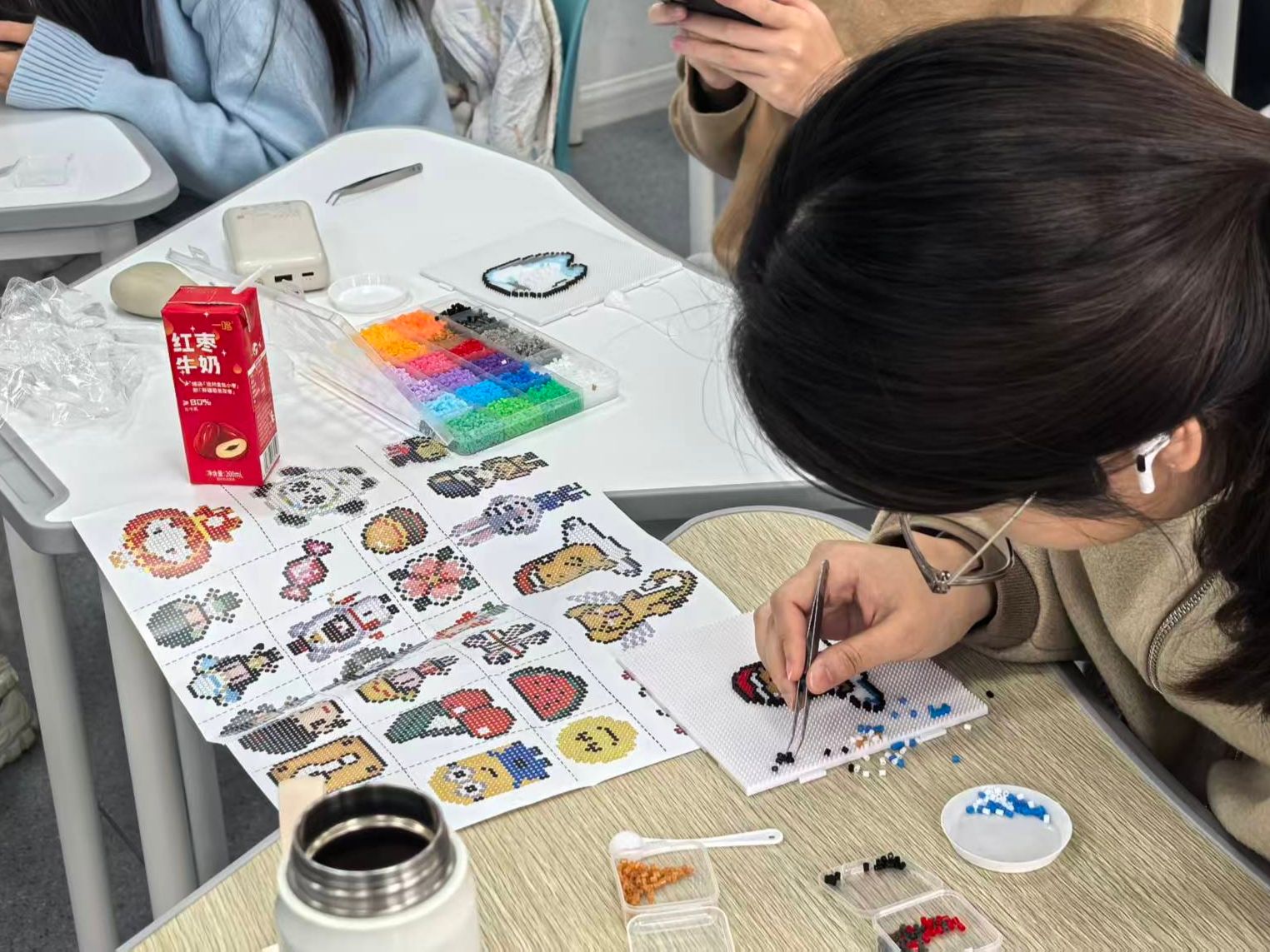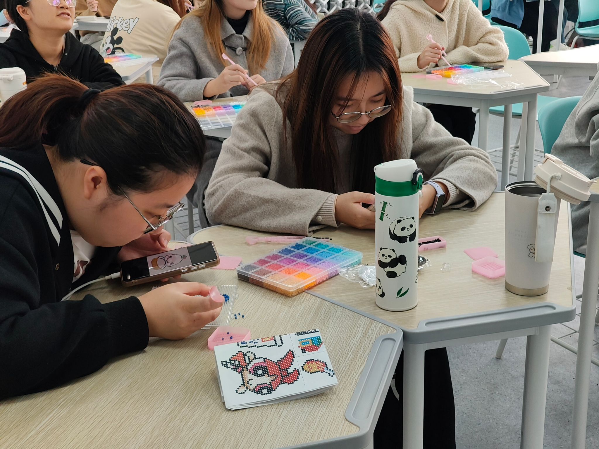 活动现场精心准备了色彩丰富的拼豆、底板与镊子等材料。同学们自由挑选心仪的颜色与图案,或参照模板细致组合,或激发灵感自主设计。大家手执镊子,俯身于方寸底板之间,将一颗颗彩豆细心排列,每一次专注的摆放,都在悄然安放当下的心绪。渐渐地,灵动的动物、可爱的卡通形象等图案跃然板上,原本零散的彩豆,汇聚成一个个独具巧思的斑斓世界。随后在工作人员协助下,同学们用低温熨斗轻轻熨烫,让分散的拼豆受热融合、固定成型。待作品冷却后,再装配上钥匙扣,一个个兼具个性、实用性与观赏性的拼豆品便圆满诞生。创作过程中,大家交流技巧、分享灵感,教室内静中有乐,指尖忙碌间心灵得以放松。